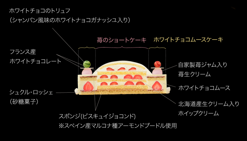 外側はホワイトチョコムースケーキ、内側は苺のショートケーキという、ケーキinケーキの技巧的な構造。断面の美しさに加え、1台で2種類のおいしさを楽しめる、豪華で美しいクリスマスケーキです。