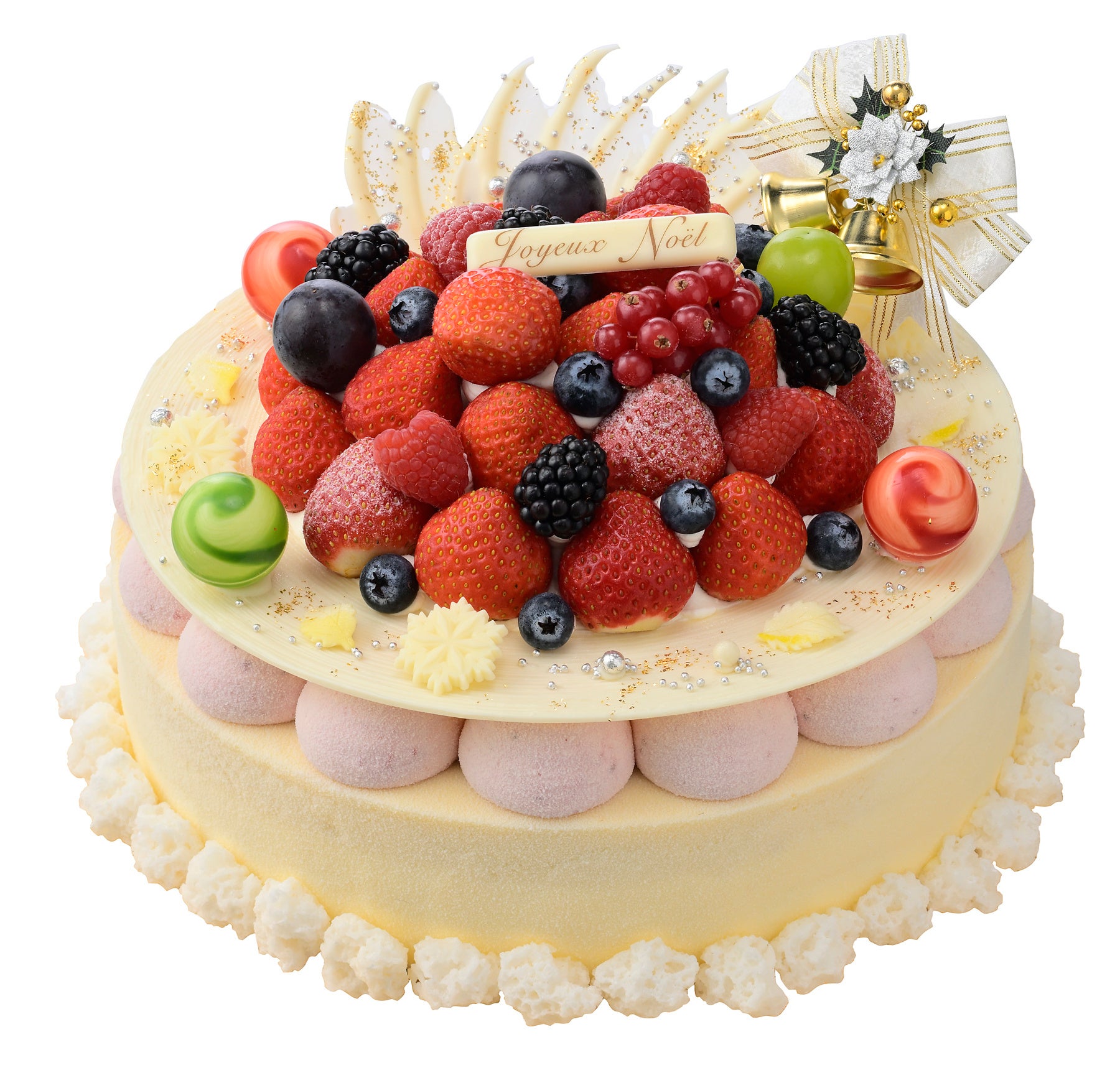 特長:中央は苺のショートケーキ、周りはホワイトチョコムースの2重構造で、1台で2種類の味わいが楽しめるデコレーションです。クリスマスのリースをイメージし、上面は苺やぶどうなどできらびやかに飾りました。銀座コージーコーナーの熟練したパティシエが選び抜いた素材を活かし、卓越した技術で仕上げたスペシャルなクリスマスケーキです。