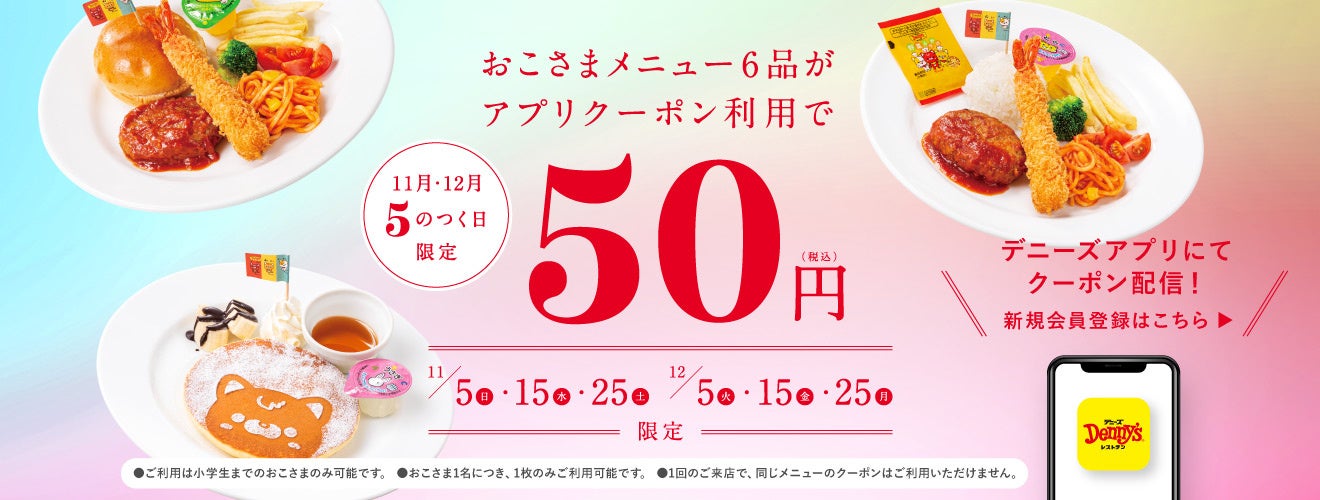 株式会社セブン&アイ・フードシステムズ(本社:東京都千代田区、代表取締役社長:小松雅美)は、11月と12月の「5」のつく5日・15日・25日に「デニーズアプリ」でおこさまメニューの対象6品が50円(税込)となるクーポンを配信します。