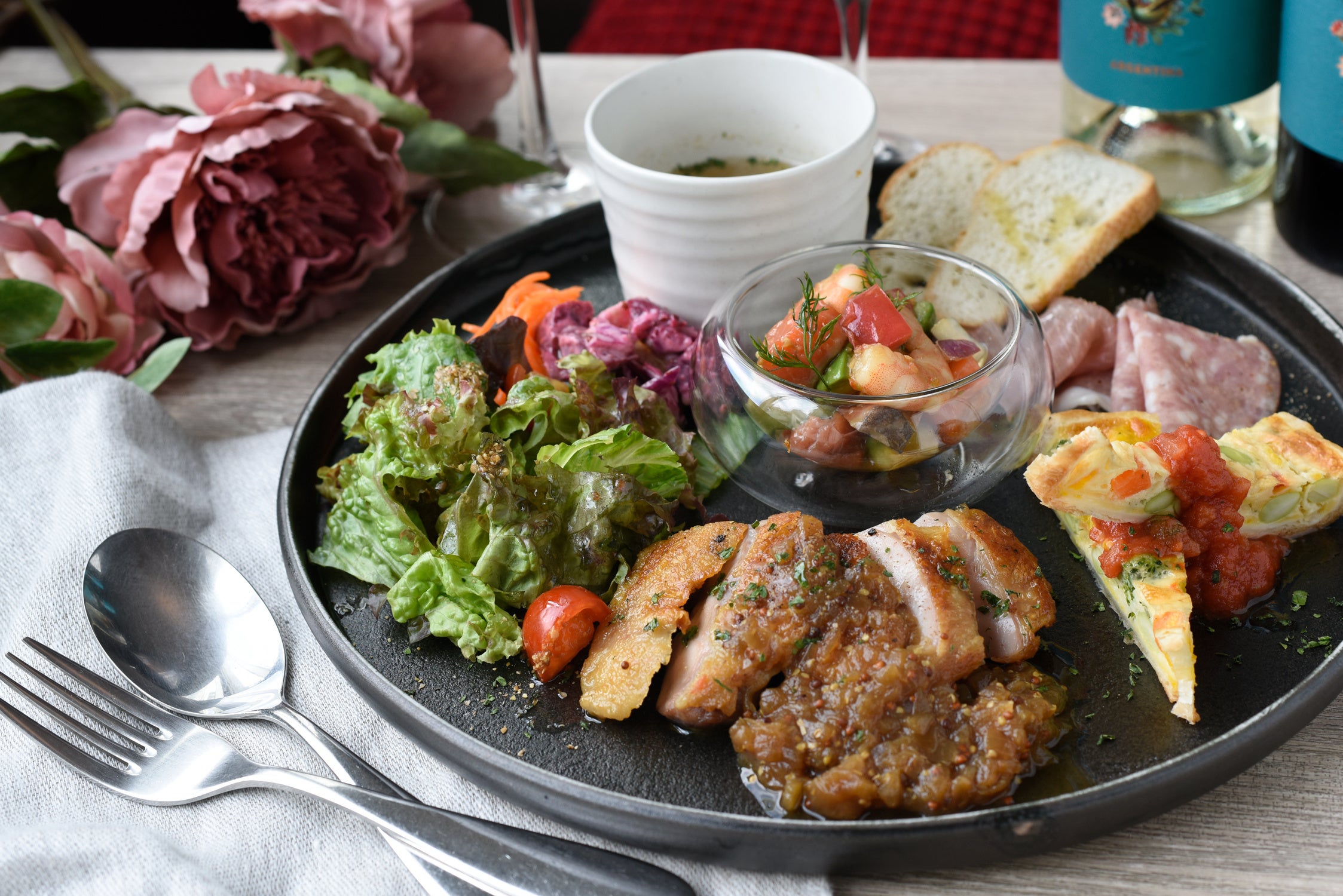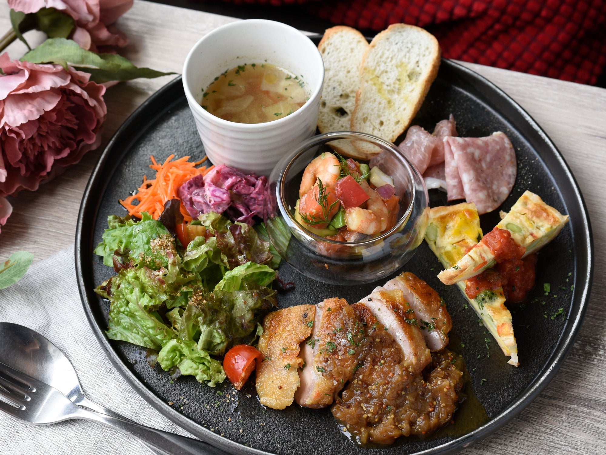 ママ友同士のランチでは、メインの“おしゃべり”に集中できる取り分け不要のメニューや、普段家庭では作らないメニューが好まれることから、チキンソテー、えびとサーモンのアボカドポキ、キッシュ、生ハム&サラミ、バゲット、サラダミックス、デリ2種、スープをワンプレートに盛り付けました。