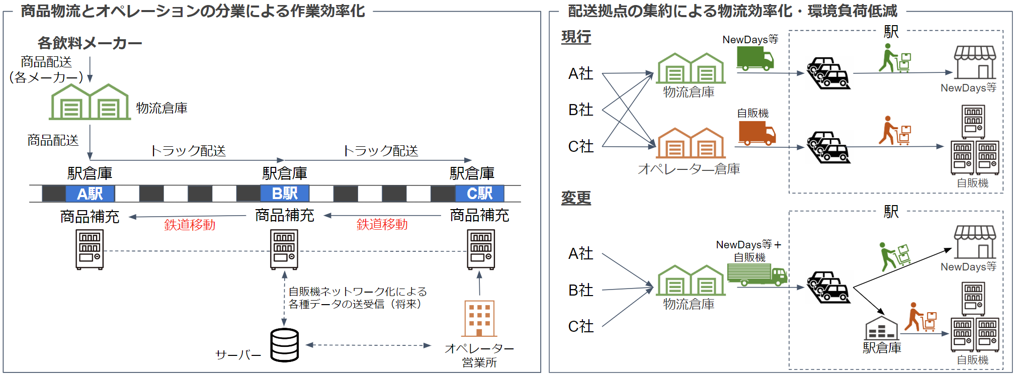・『鉄道利用オペレーション』とは、様々な環境変化に柔軟に対応し、サステナブルな事業運営体制の構築を目指す新たな自販機の稼働スキームです。従来は、自販機で商品を補充して販売する場合、補充を行う自販機オペレーターは、補充のみならずトラックの運転も必要でした。今回のスキームでは、商品の配送とオペレーション業務が分かれ、トラックドライバーは駅の倉庫納品までを担い、補充を行う自販機オペレーターは、電車で駅間を移動し補充業務を担います。この改革により、目前に迫る「物流の2024年問題」に備え、トラック輸送の負担を軽減するオペレーション体制・オペレーション人員不足の解消・生産性の向上等を目指します。