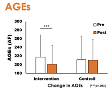 実験群は、AGEsと体脂肪量が有意に減少し対照群の変化は見られませんでした。具体的には、実験群のAGEsのスコアが217から193へと減少し年齢換算をすると-7歳、体脂肪は平均で1kg減少しました*。
