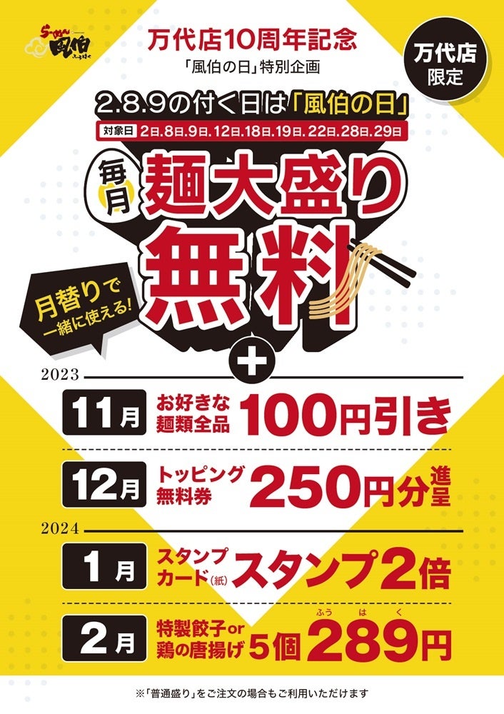 【風伯の日】には麺大盛り無料に加え月替わりでお得なサービスをご提供します。