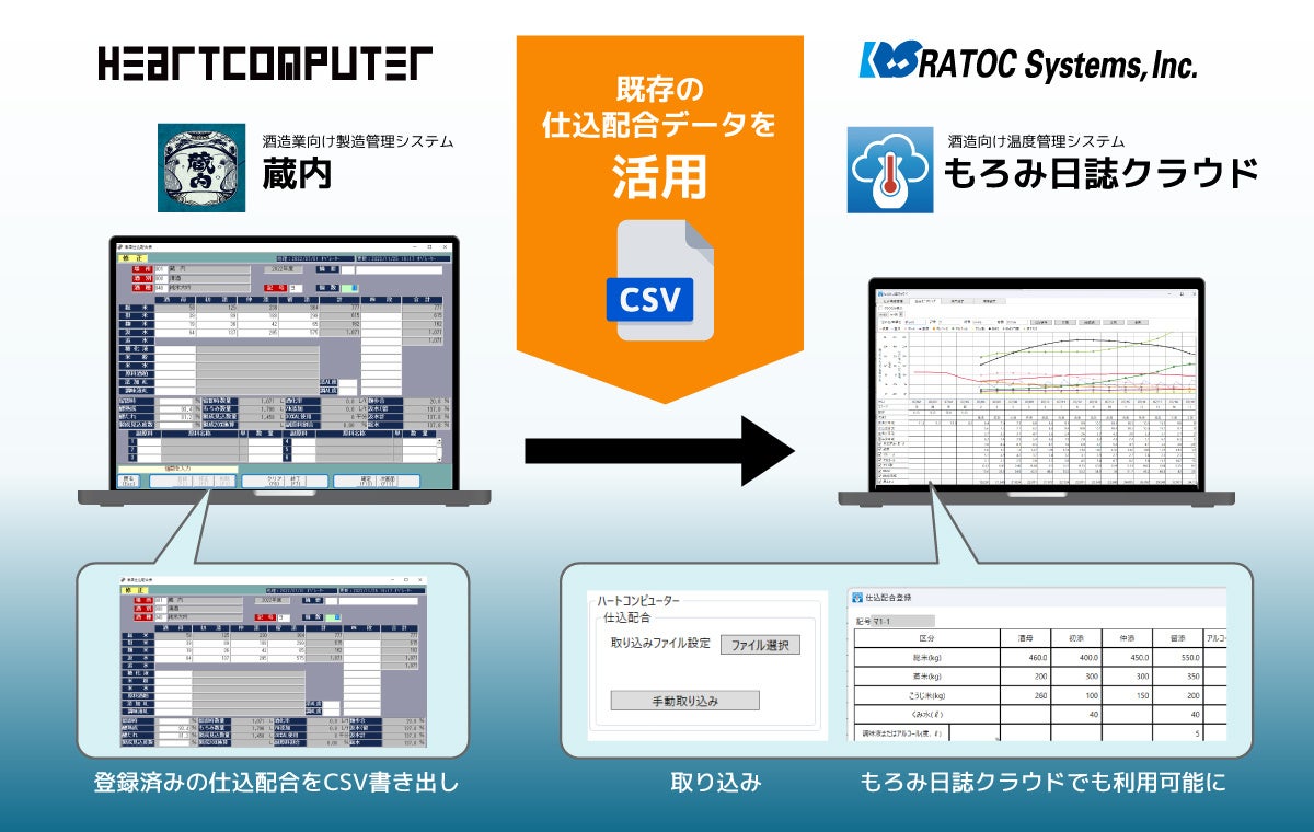 一方、蔵内は、酒類におけるスタート地点の製造計画(仕込配合表)から、瓶に詰める詰口まで、連続性のあるデータとして保存し、帳票や申告書を作成するシステムです。すでに蔵内で仕込配合表を検定などで活用している場合は、書き出したCSVファイルをもろみ日誌クラウドで指定し、仕込配合として取り込みをおこなうことができるようになりました。このデータは、もろみ製造帳、経過簿などへの適用が可能です。
