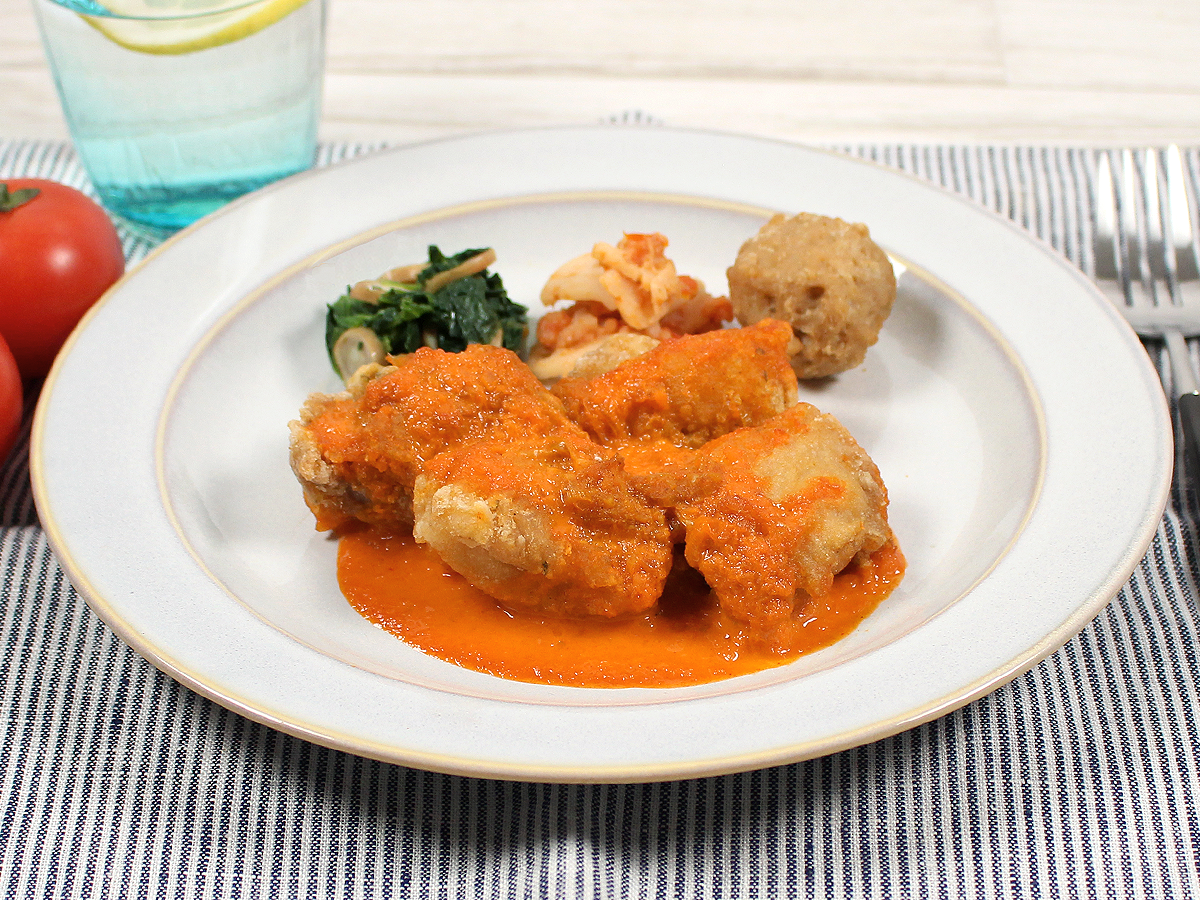 鶏むね肉をフライにして、カレー風味のスパイシーソースで仕上げました。たんぱく質を摂取したい方にピッタリのプレートです。付け合わせのネギとソースをよく絡めてお召し上がり下さい。