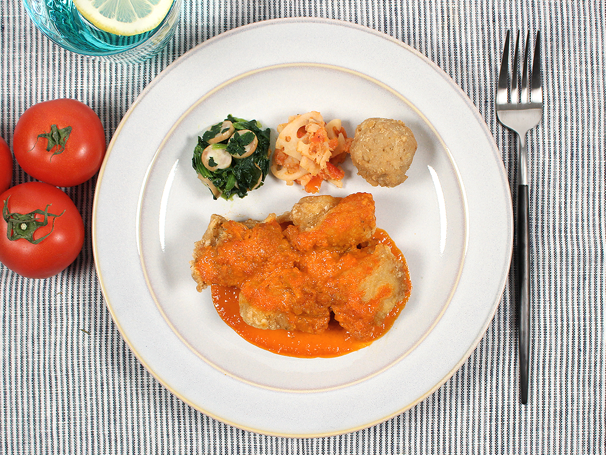 副菜は、あっさりと鶏ガラで仕上げたほうれん草ウインナー、トマト入りのれんこんツナサラダ、こがし醤油の香るミートボールです。