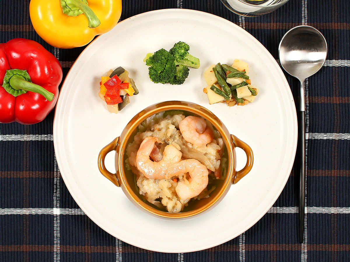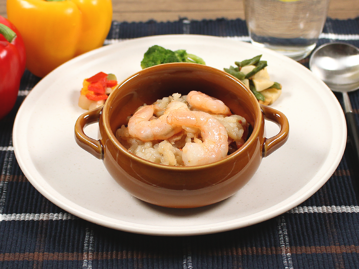 プリプリで旨味たっぷりの海老ときのこ類を、コンソメ仕立てのリゾットに仕上げました。チーズを隠し味にしたガーリック風味のプレートです。