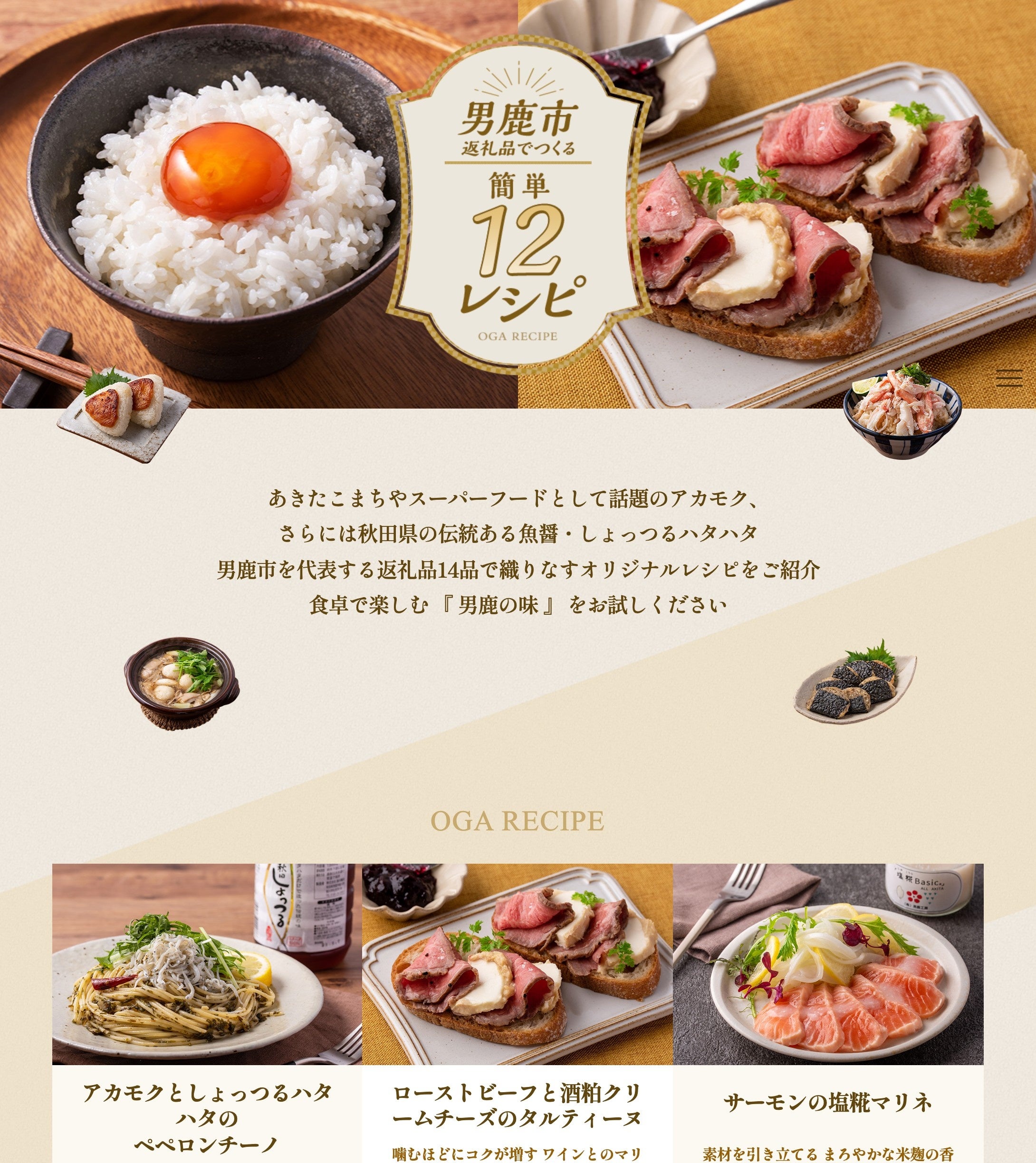 男鹿市のふるさと納税業務支援は2019年から行っており、これまで同市とともに男鹿市ふるさと納税LINE公式アカウントの開設・運用など多様な施策に取り組んでおります。今回のレシピ企画は、「男鹿市の魅力を食卓で体験して欲しい!」という想いを持った当社の男鹿市担当チームが企画立案しました。コンテンツページでは、男鹿市のふるさと納税返礼品から、魚醤・しょっつるハタハタ、紅ズワイガニなどの14品の地場産品を組み合わせた様々な料理レシピを公開しています。男鹿市の地場産品を食べ慣れている方にも新たな発見を楽しんでいただくため、レシピはすべてオリジナルのものを掲載しています。