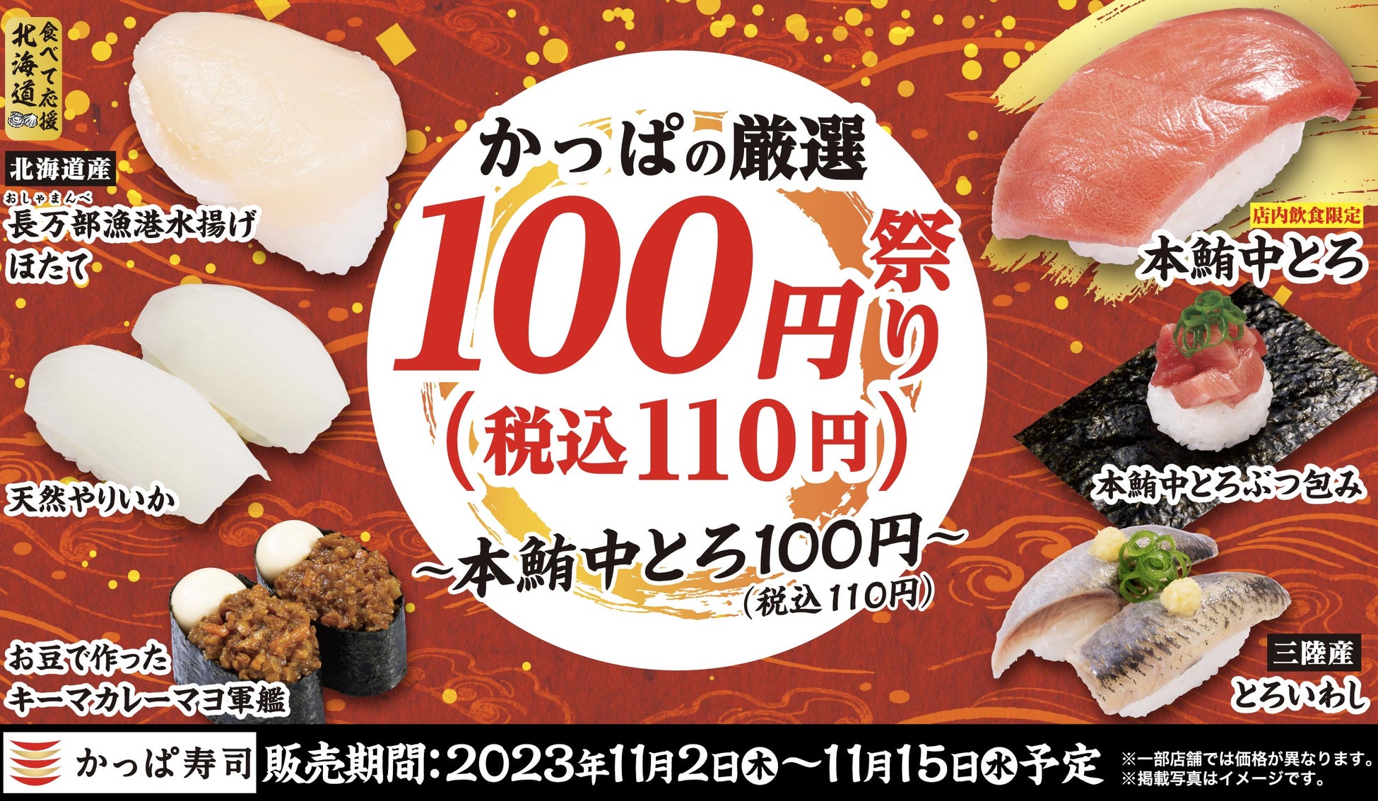 かっぱ寿司は、うまい寿司を手頃な価格で思う存分楽しんでいただきたいという思いで、一皿110円という価格と品質にこだわり続けています。さらに、その時々の厳選ネタを一皿110円で提供する「厳選100円(税込110円)祭り」も定期的に開催しております。