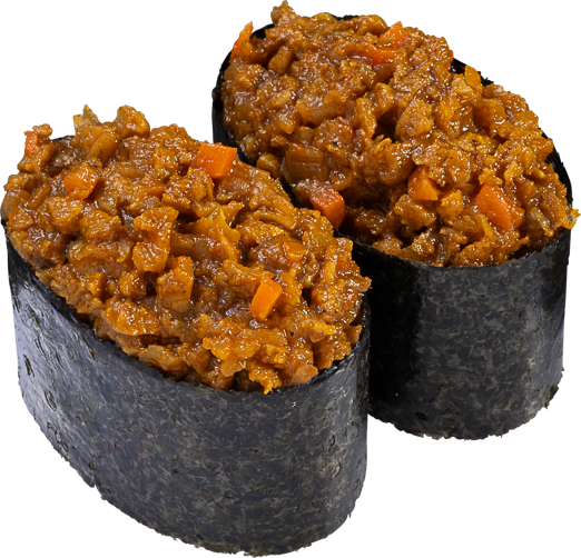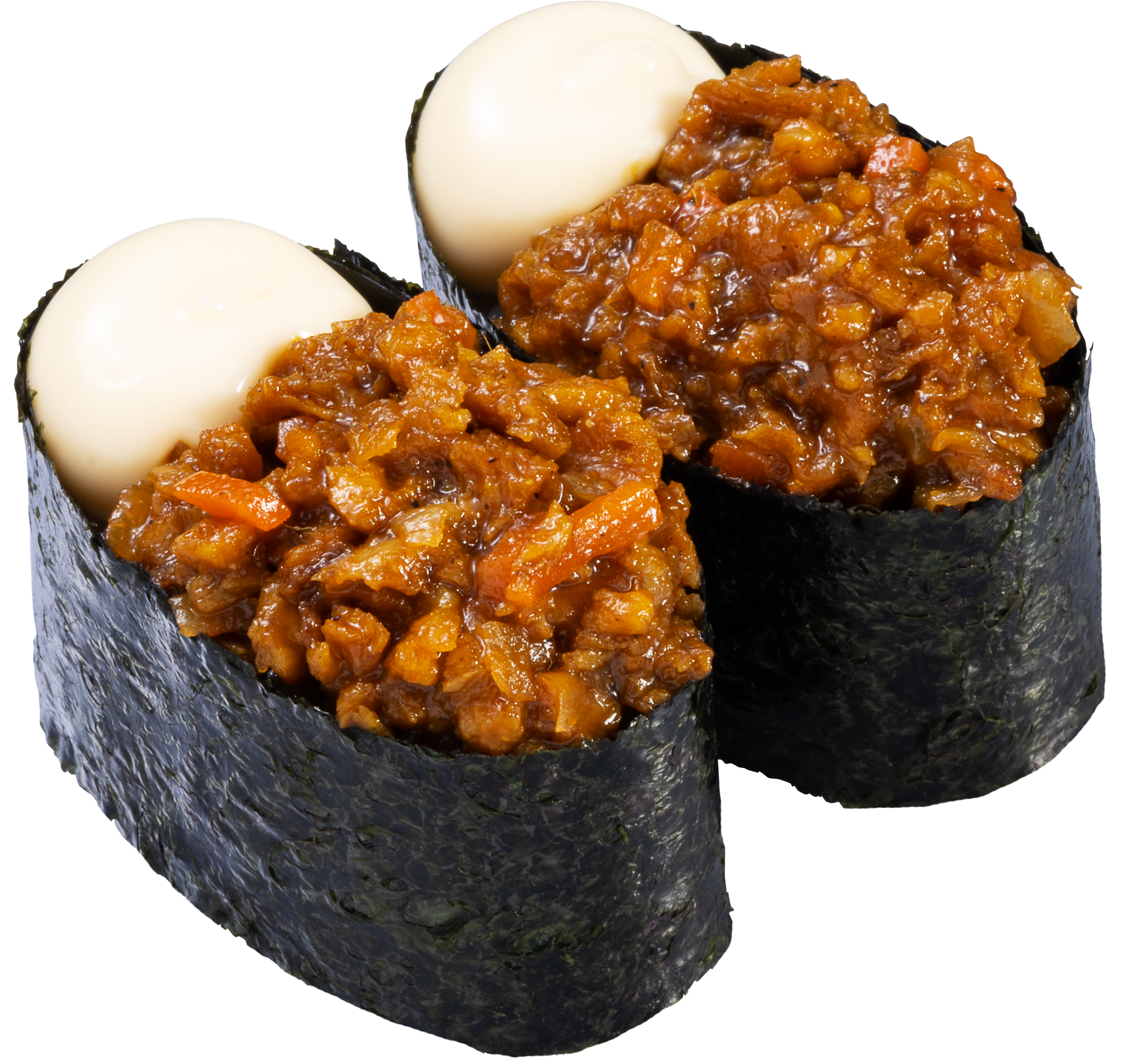 スパイスの香りが食欲をそそる大豆ミートのキーマカレーにマヨネーズを合わせた軍艦です。