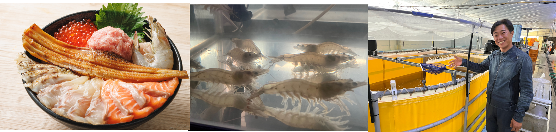 「発見!ふくしまお魚まつり」の目玉メニューであるノドグロやヒラメ、アナゴなど福島各地の魚介を贅沢に盛った「ふくしま全部のせ丼」に、福島県葛尾(かつらお)村に設立された「HANERU(はねる)葛尾」(松延紀至社長)が養殖した生エビが仲間入りします。同社は、福島の復興に貢献しようと、国内最大級のバナメイエビ養殖場を目指して2022年に創業しました。人工海水を浄化・循環させる養殖技術により、臭みもなく生でもおいしく食べられます。プリップリの食感の生エビをぜひ味わってみてください。