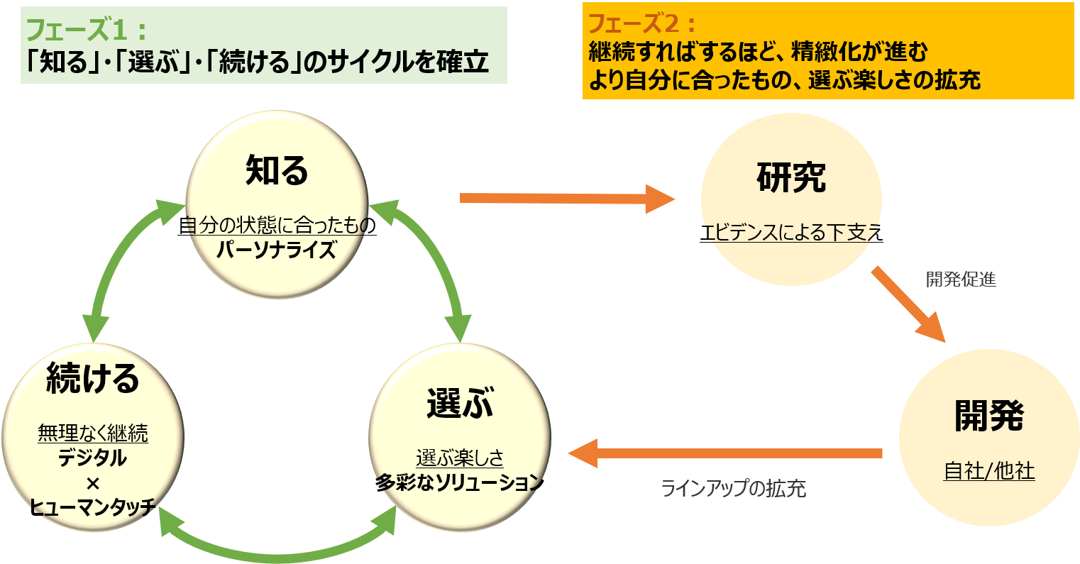 【総合的な食ソリューションプラットフォーム概念図】 ※本件はフェーズ1の「続ける」に寄与