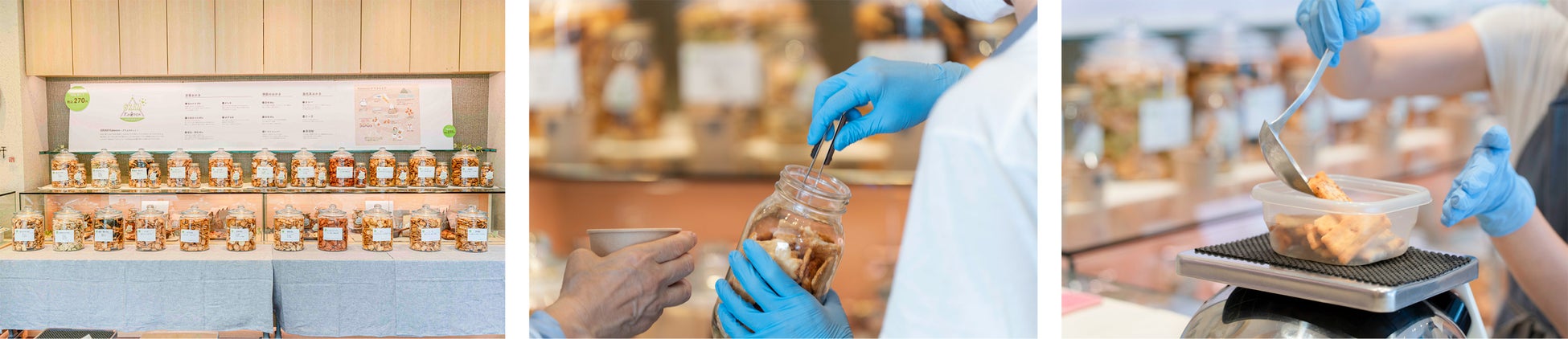 ご自身のペースで試食をしながら好きな味を選び、お気に入りの容器を見つけ、好きな量だけおかきを詰めてお持ち帰りいただける、「GRAM Kakecco」POP UP STOREを開催します。店頭に並ぶ商品は、“欠けたおかき”であるものの、味は全く損なわれることなく出来上がった、通常商品と同じ品質のおかきです。GRAM Kakeccoでは、そんなおかきを通常商品よりも手頃な価格でお買い求めいただくことができます。