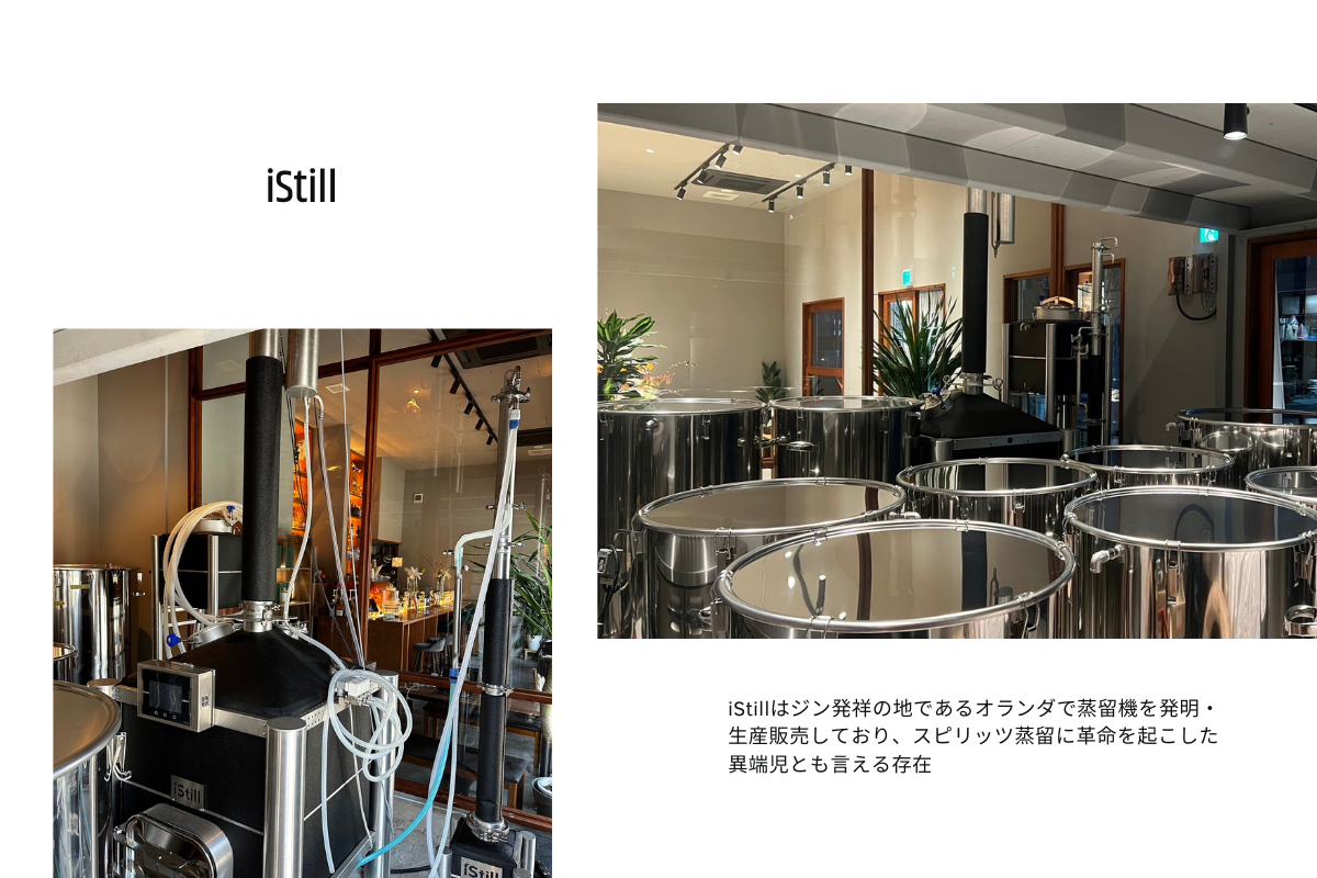 世界中のジンを扱ってきたジン専門店が運営する、飲食店併設型蒸留所「SiCX京都東山蒸留所」。こちらと連携し、ジンの蒸留を行います。40以上の特許を取り入れ、A Iを搭載した蒸留設備「iStill」を活用することで、品質が安定し、製造コストの抑制にもつながります。