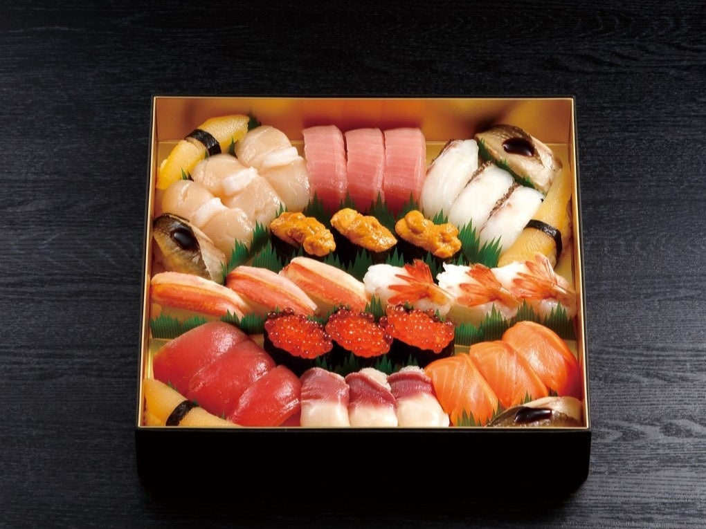 鶴:5人前<握り60貫> 18,000円(税込) 新年を祝う食卓に華を添える年に一度の特別厳選握りです。 <内容> トロ/道産大ホタテ/数の子/本ズワイガニ/サーモン/マグロ/道産ホッキ/イクラ/穴子/湯引き真鯛/ウニ/ぼたん海老 |