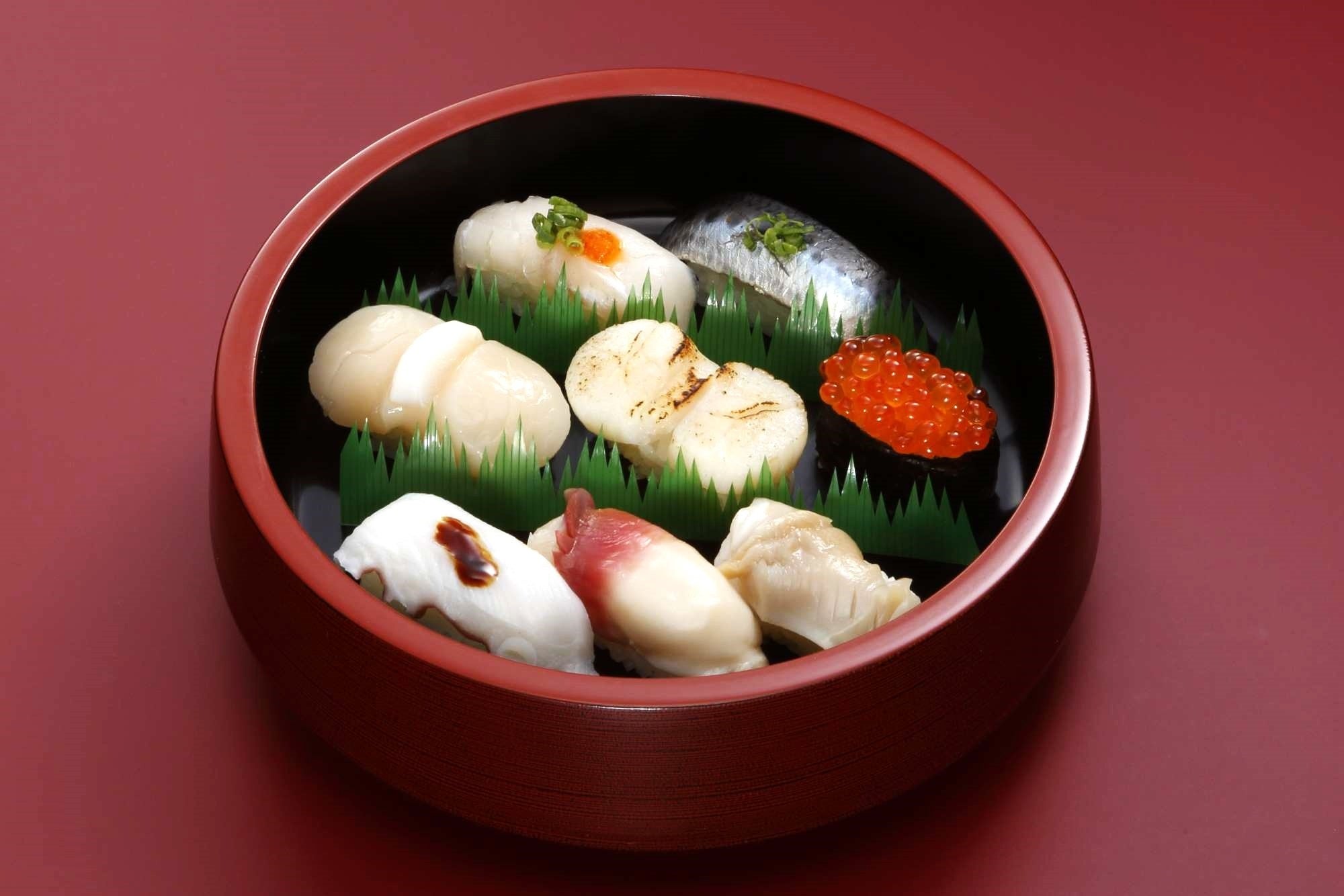 北海道応援にぎり: 1人前 1,480円(税込) ヒラメ/イワシ/大ホタテ/炙り大ホタテ/イクラ/タコ/ホッキ/ツブ ※付け合わせ別売り |