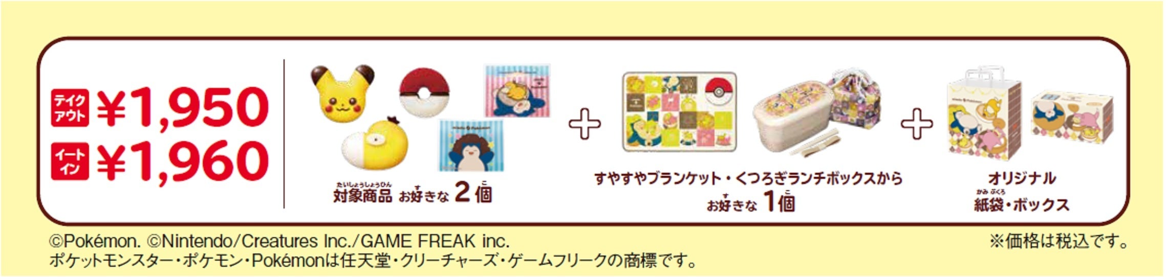 ドーナツとグッズを一度にお楽しみいただけるグッズセットには、「すやすやブランケット」「くつろぎランチボックス」が登場。おこさまには「のんびりおさんぽポーチ」がセットになった、おこさまグッズセットをご用意しております。ピカチュウやコダック、カビゴンなどが描かれたオリジナルデザインで、かわいいクリスマス専用のボックスと紙袋に入れてご提供します。