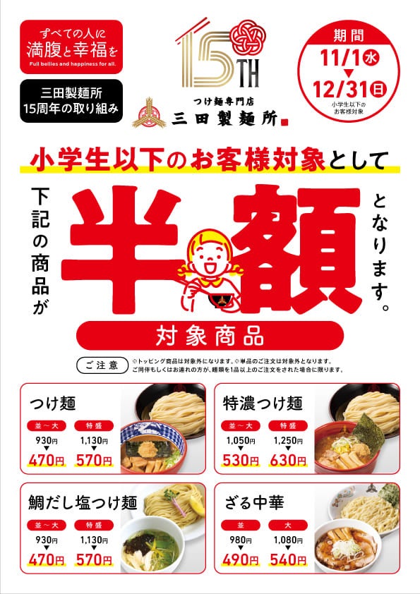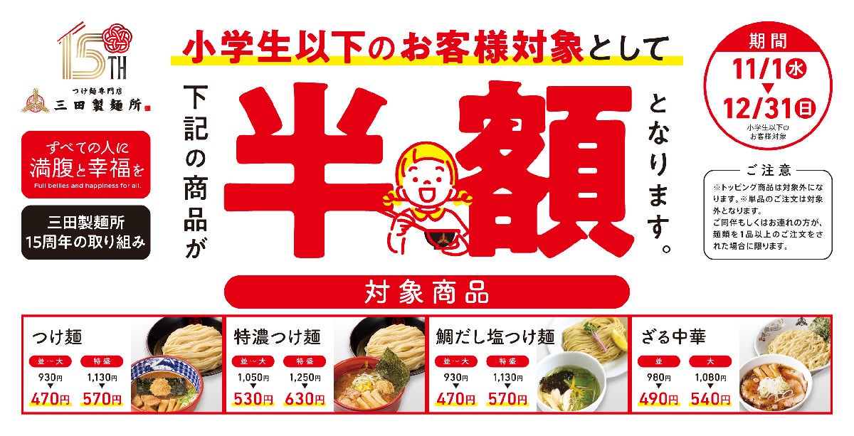 また、『#子どもせいめんじょ』の取り組みを多くの方に知っていただくため、2023年11月1日から12月31日の期間中は、”毎日”半額で提供させていただきます。これを機に、三田製麺所の食育活動を普及していければ幸いです。