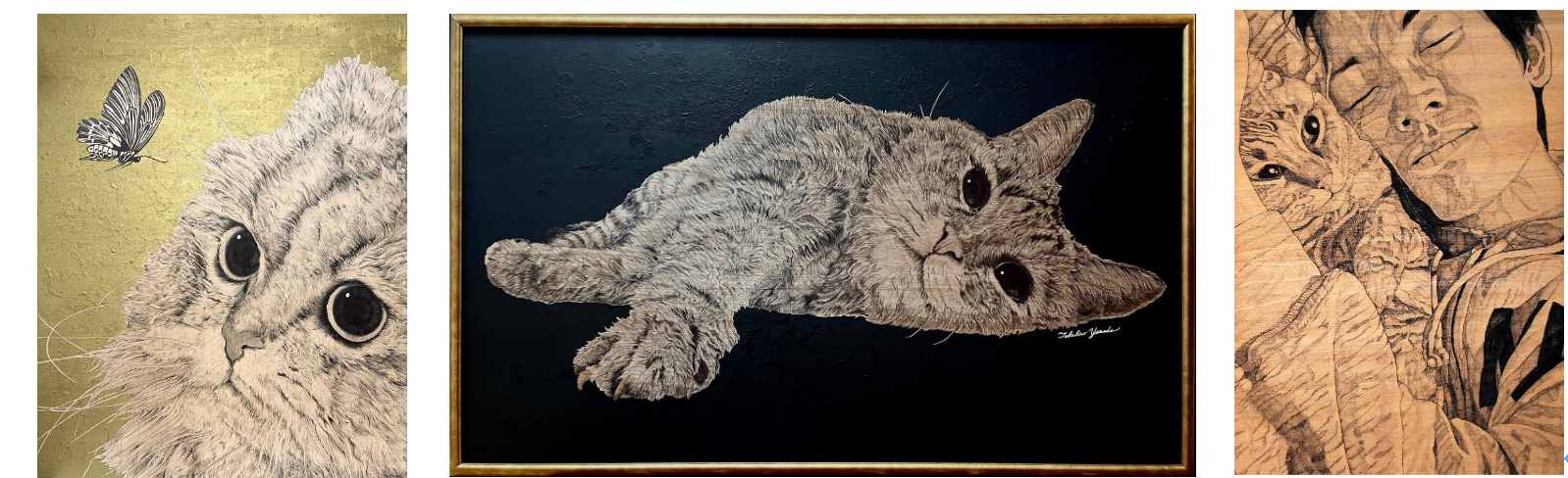 動物をテーマに、主に猫の白黒ペン画を描くほか、犬、フクロウ、ぬいぐるみなど、毛のあるものをよく描く。シンプルな画材を通じ、動物の温かみ、生き生きとした様が紙の上に現れることを目指す。コロナ禍をきっかけにデジタルとアナログの融合を模索した『フェルメール猫』、AIを使った『量産中』シリーズも展開。