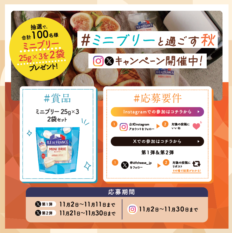 イル・ド・フランス公式SNSアカウントにて、合計100名様に「「ミニブリ―25g(3P)」が2袋当たるキャンペーンを実施します。是非この機会に『イル・ド・フランス』のフランス産ナチュラルチーズをお楽しみください。