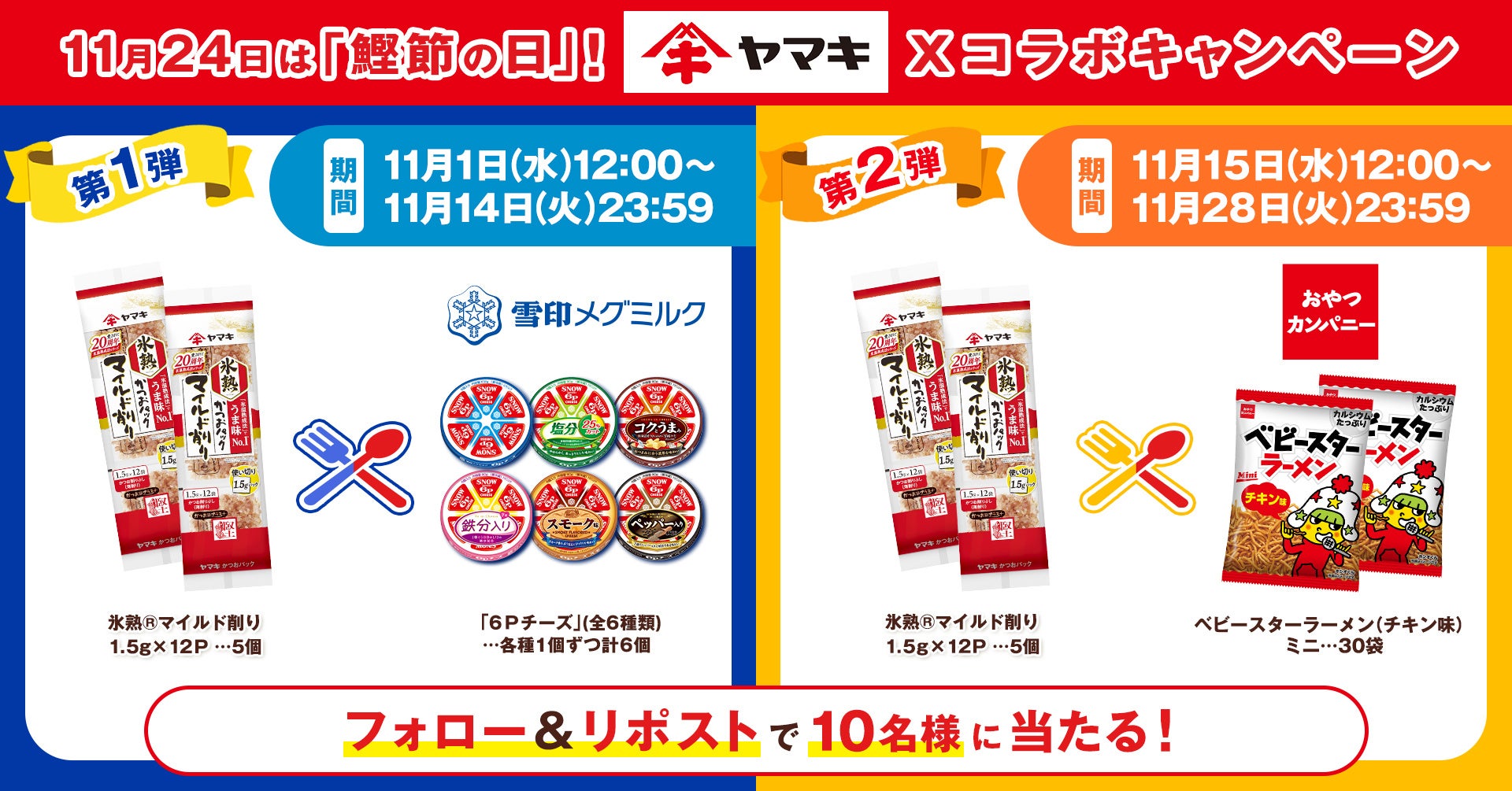 第1弾・第2弾に分けリレー形式で行うコラボ企画で、各14日間ずつ実施します。ヤマキ公式X(旧Twitter)アカウントと各コラボ先企業の公式X(旧Twitter)アカウントをフォローし、該当のキャンペーン投稿をリポスト(旧リツイート)した人の中から抽選で、ヤマキが独自製法で作る、「氷熟®マイルド削り」 (※)と、コラボ先企業のかつお節と相性の良い商品をセットにしてプレゼントします。