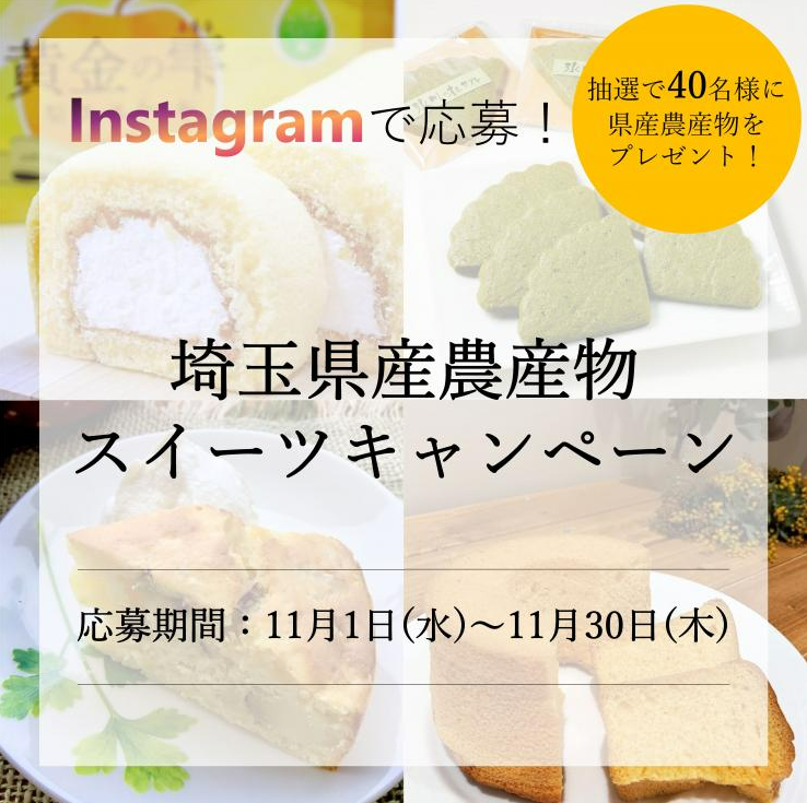 キャンペーン対象の県産農産物スイーツを食べた感想をインスタグラムで「#埼玉県産農産物スイーツキャンペーン 2023」をつけて投稿いただいた方の中から抽選で40名に、「彩の国黒豚」や「彩のきずな」などの県産農産物をプレゼントします。