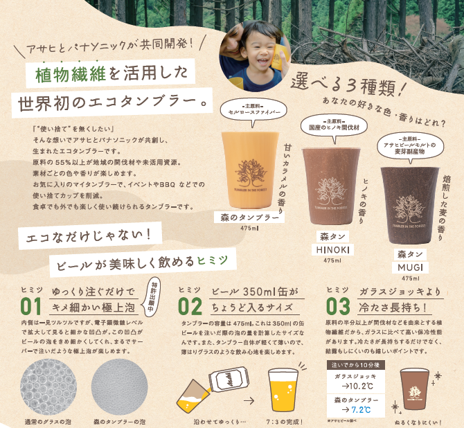 「森のタンブラー」はアサヒビールとパナソニック株式会社が2019年に共同開発したリユースできるエコカップです。