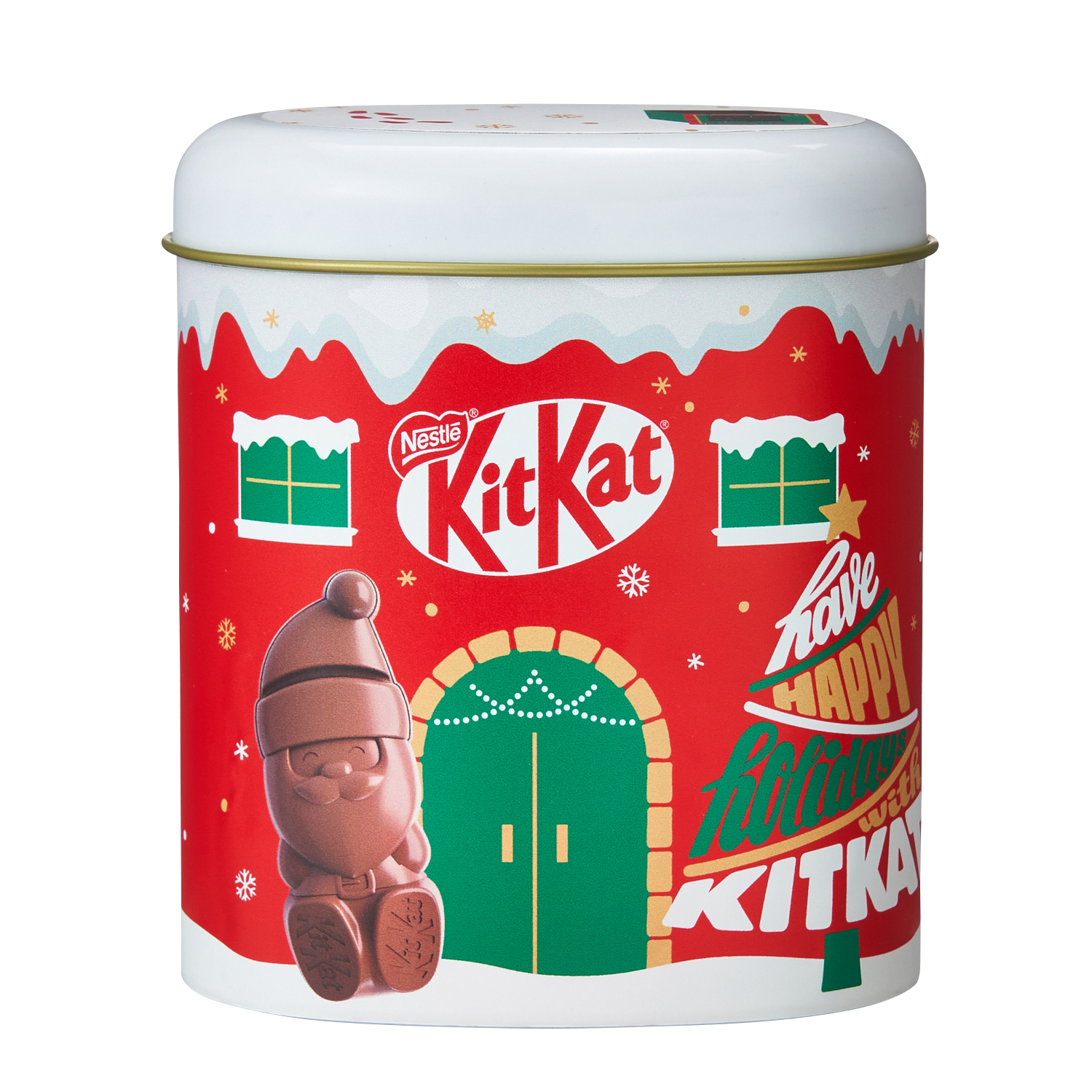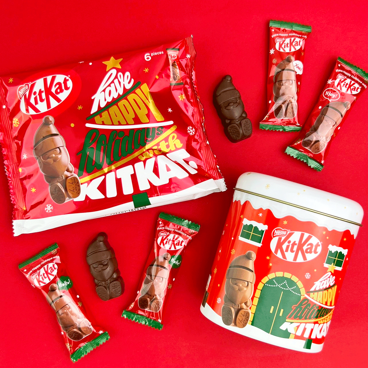 「キットカット ホリデイサンタ」は、サンタクロースの形をした特別な「キットカット」。個包装には“Xmas!”や“Thx!”など6種類のカジュアルなメッセージがデザインされていて、プチギフトにもぴったりです。今年は新たに「缶タイプ」が仲間入り!サンタのおうちでクリスマスパーティーが開催されるワクワク感が表現された、楽しいデザインです。