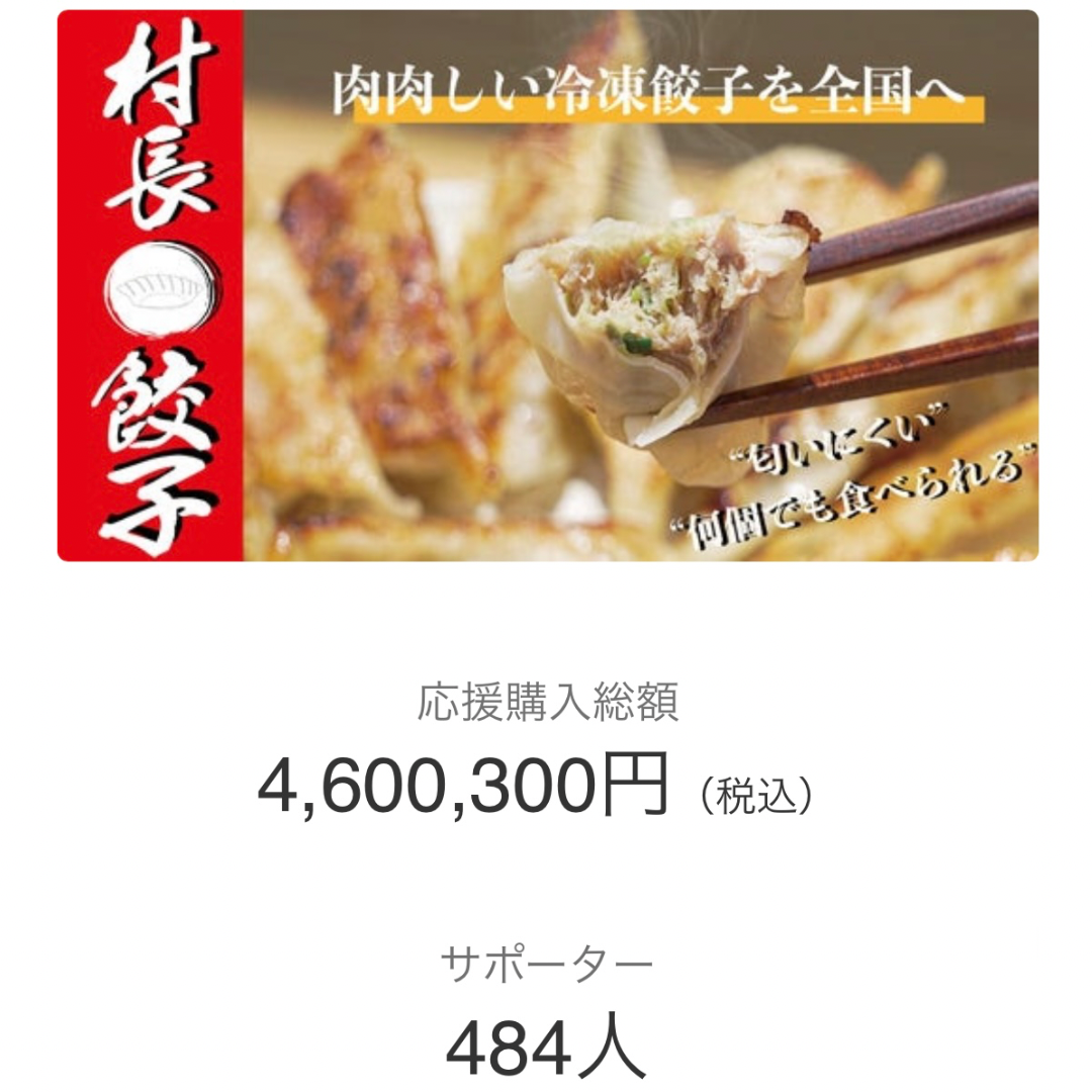初めてのクラウドファンディングでしたが、“村長餃子”は三大プラットフォームである『Makuake』で冷凍食品部門&餃子部門において、歴代最高額の応援購入額を達成し冷凍餃子界の伝説となりました。