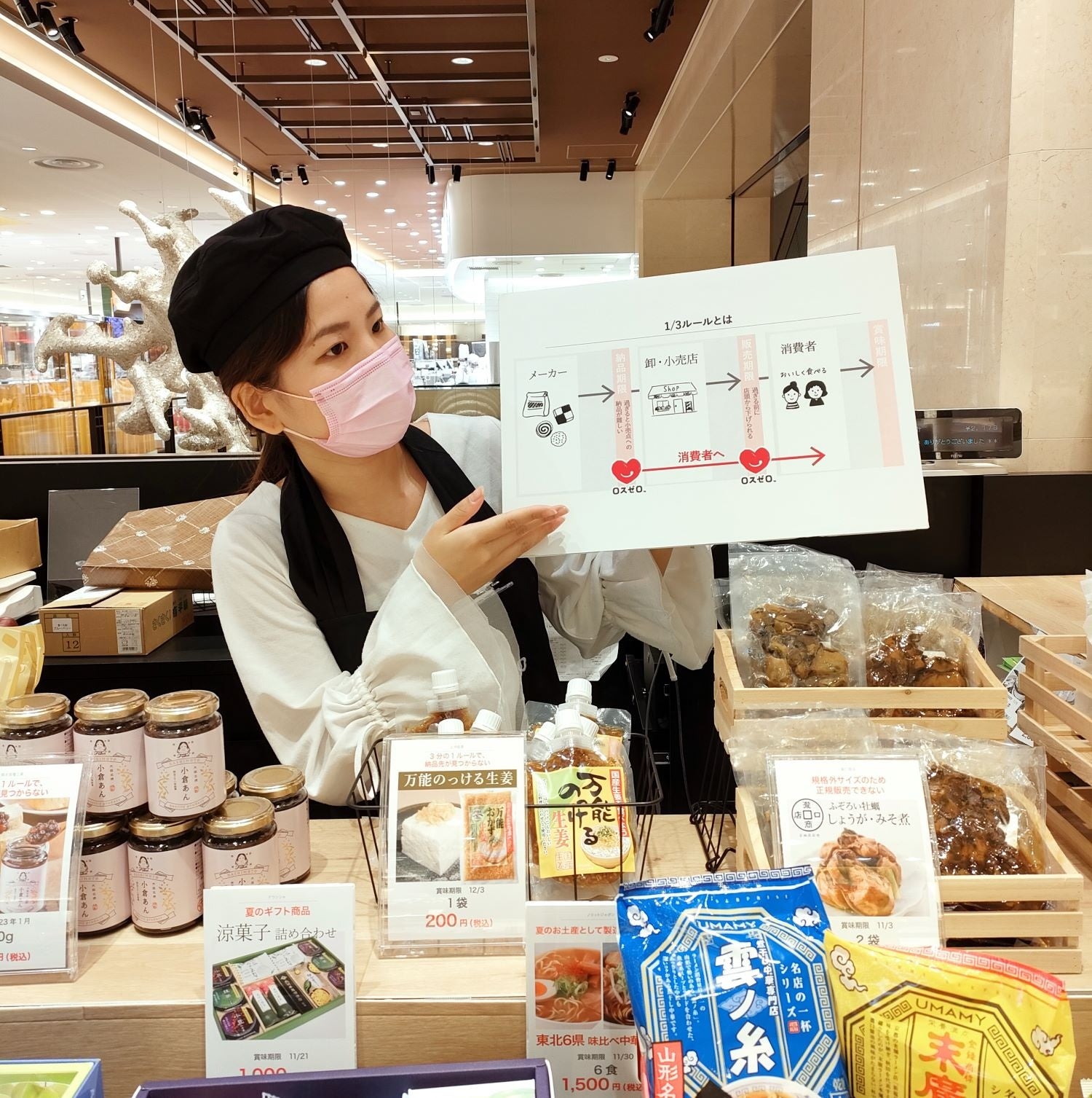 (右画像:3分の1ルール※について説明するロスゼロスタッフ)