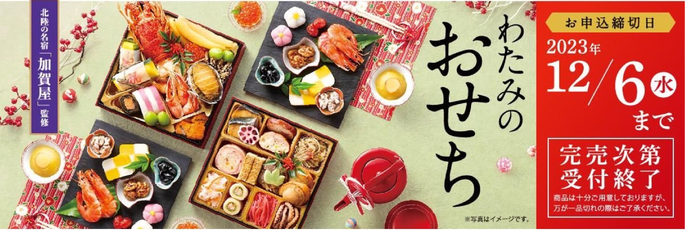 「わたみのおせち」は自社農場「ワタミファーム」の豊かな環境で育った有機野菜を一部お料理に取り入れており、野菜そのもののおいしさをお楽しみいただけます。また、明治39年創業の能登を代表する老舗旅館「加賀屋」監修のお料理もご堪能いただけます。私たちは、そんな多彩なお料理と「まごころ」をお届けすることで、お客さまに健康的でゆとりのある、いきいきとした生活を実現していただきたいと考えております。