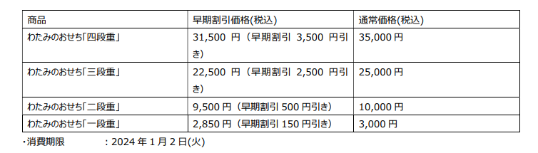 ※注文締め切り日 ①早期割引価格:2023年11月15日(水)②通常価格 :2023年12月6日(水)※完売次第受付終了