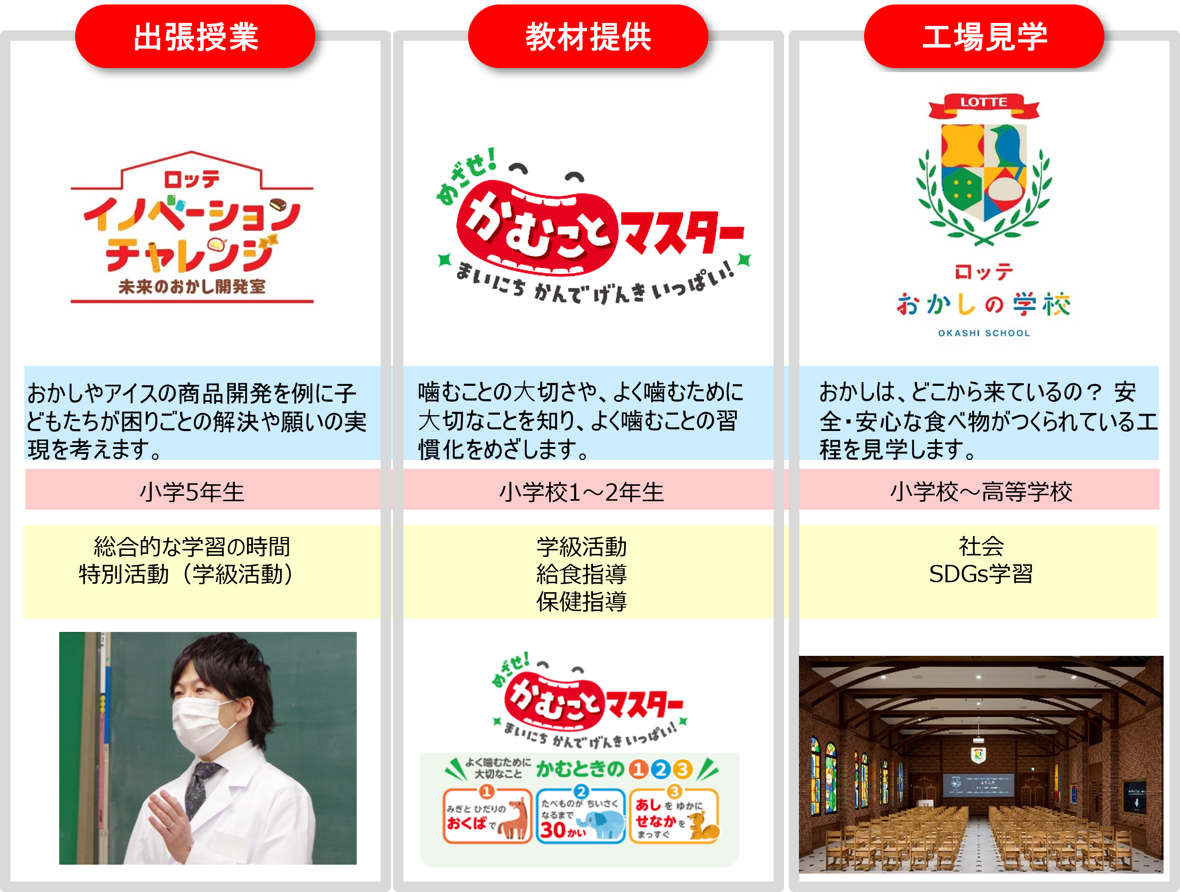「ロッテの食育」として、3種の異なるアプローチから、多面的に子どもたちの未来づくりを支援しています。