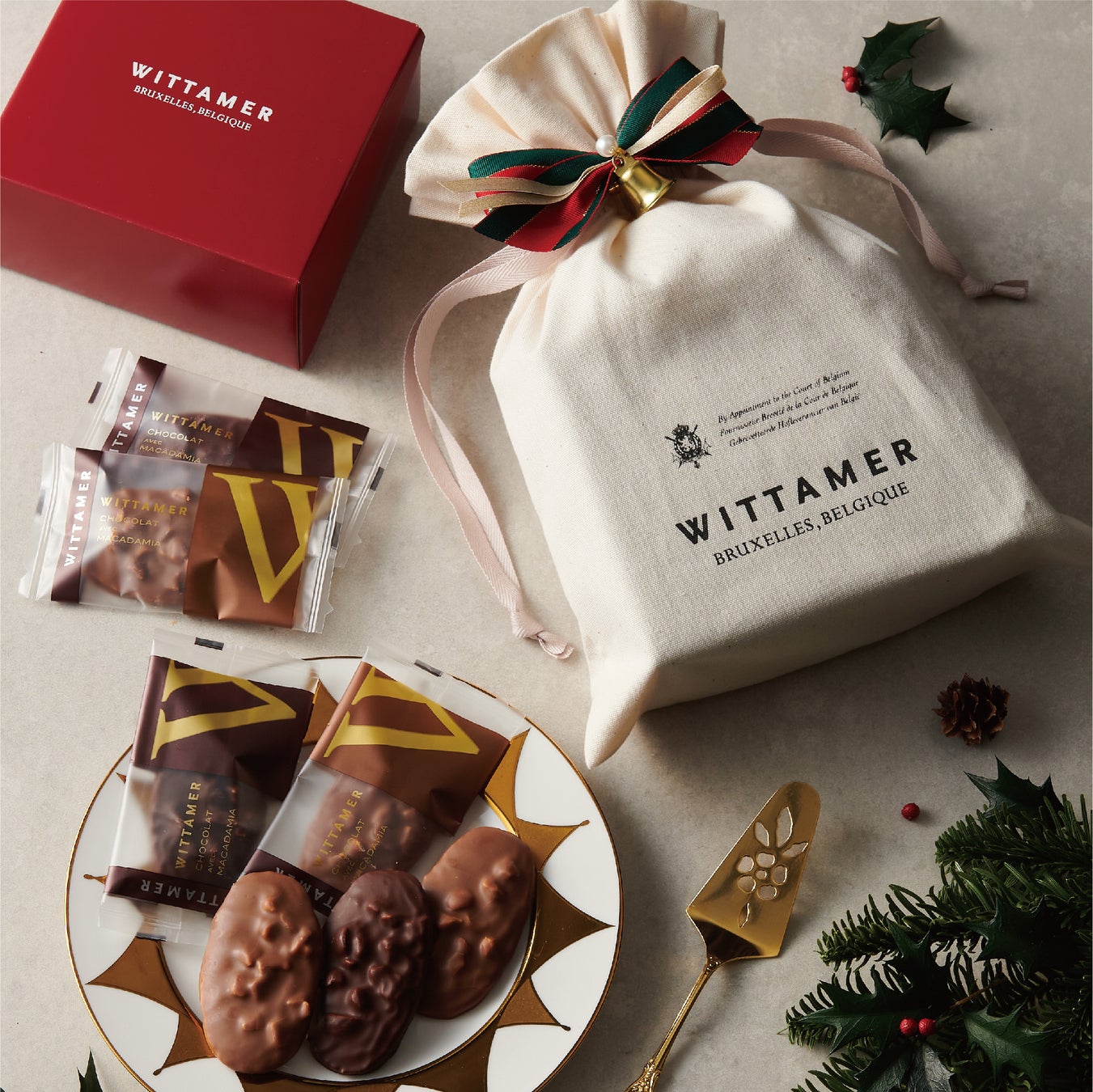 サクサクのサブレにマカダミアナッツとアーモンドをのせ、チョコレートでコーテイングした「マカダミア・ショコラ」をオリジナル巾着に詰め合わせた新登場のクリスマス限定ギフト。