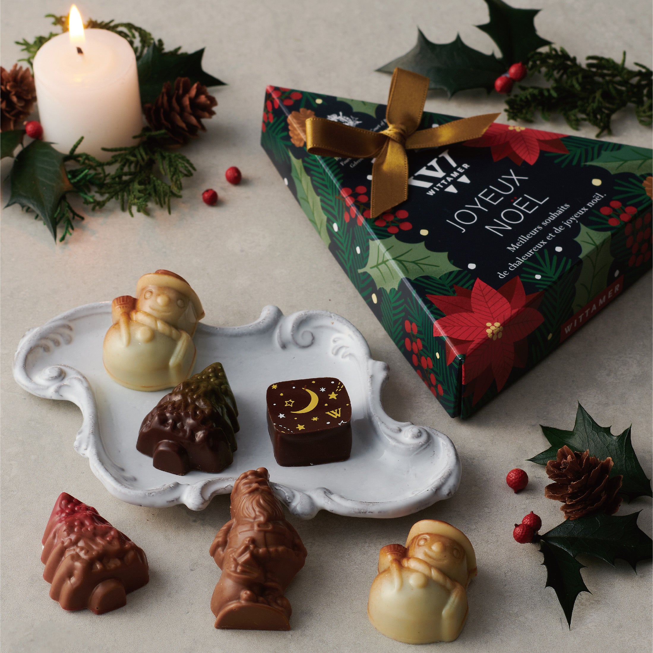 ヴィタメールを代表するプラリネショコラやトリュフと、クリスマス限定の雪だるまやツリーのショコラを詰め合わせ。ヴィタメールのショコラを存分に楽しめるひと箱です。