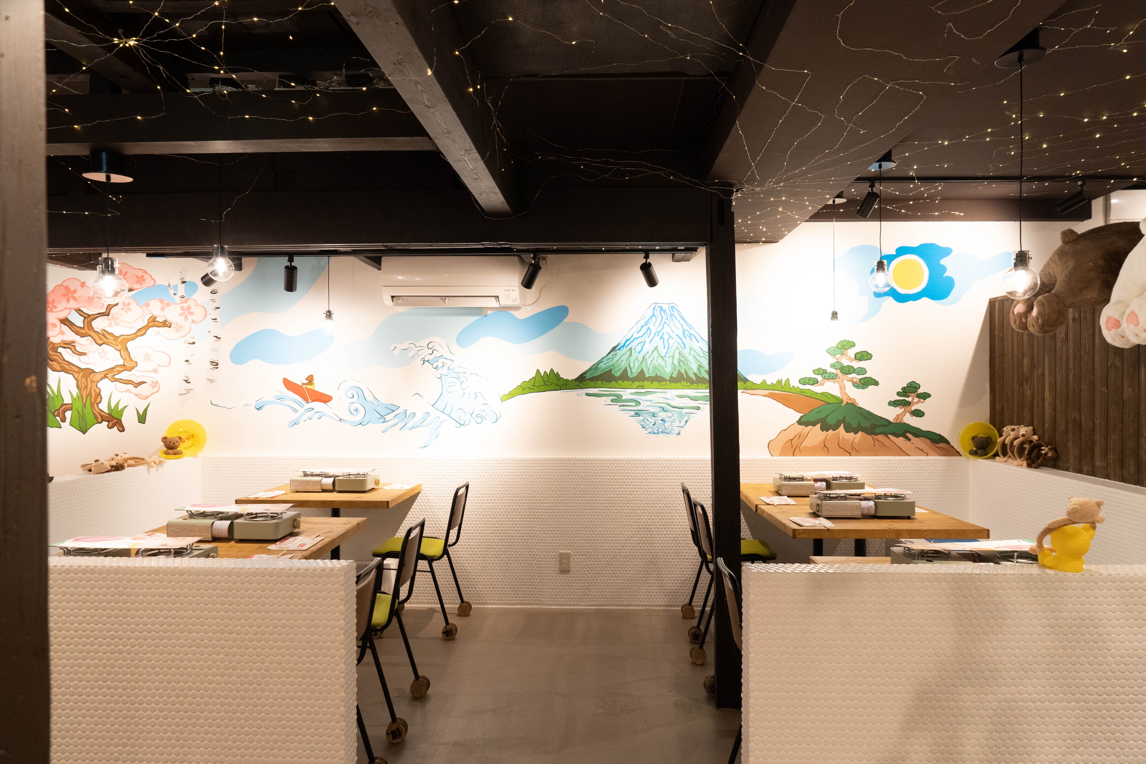店内に入るとまず見えるのは、くまちゃんが座る番台。店内には、北海道の自然を感じる白樺席、壮大な景色を満喫できるカウンター席、大きな壁画が圧巻のタイル貼りの大浴場、木の温もり溢れるサウナ席。北海道らしい設えと“温泉旅館”のような空間でフォトスポット満載。誰もが体験したくなる“くまちゃん”の世界観が広がっています。