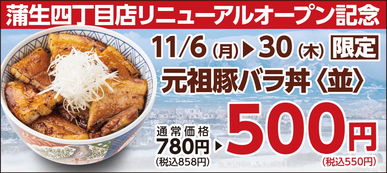 蒲生四丁目店のリニューアルオープンを記念して、11/6(月)〜30(木)の期間中、当店自慢の「豚バラ丼〈並〉」を特別価格550円(税込)にて提供いたします。