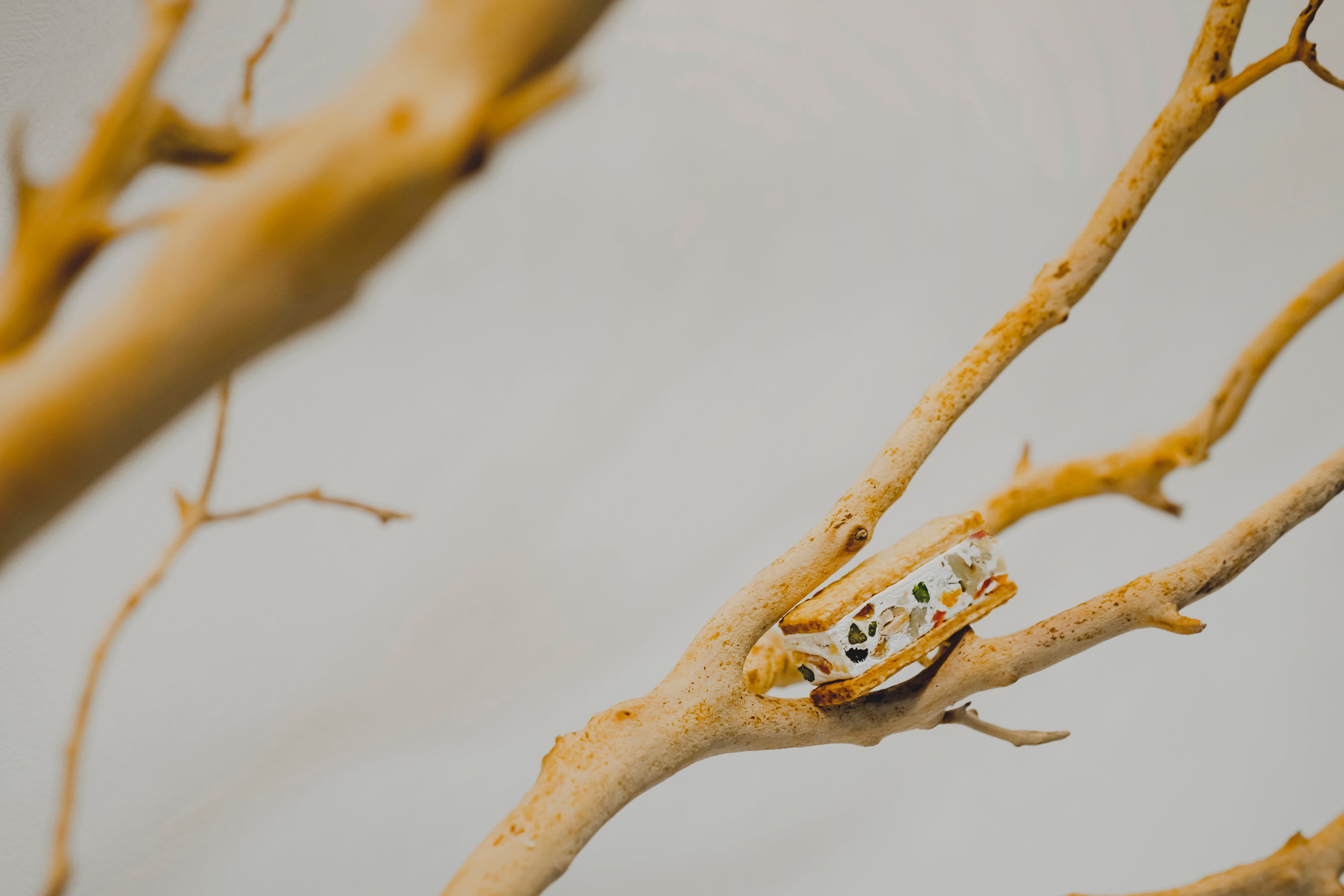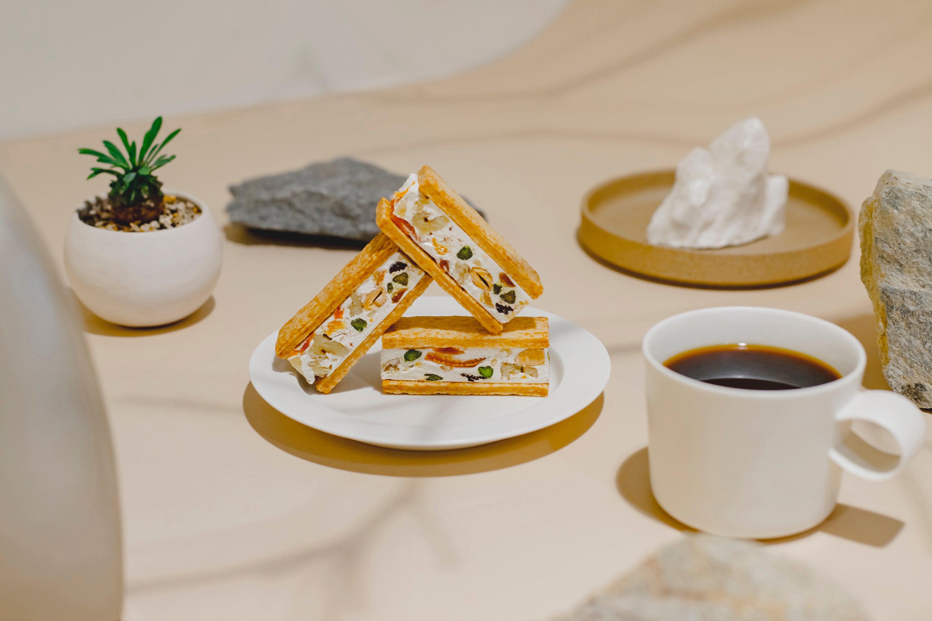 ヌガーサンドは、フランス・プロヴァンス地方でポピュラーなメレンゲ菓子“ヌガー”をクッキーではさんだお菓子です。FROM NOUGAT SHOPのヌガーは、混ぜ合わせる際に空気を感じさせる柔らかさを表現しながら、クッキーと一緒に食べ合わせたときの絶妙なバランスを意識しました。様々な食感のコントラスト、素材が織りなす豊かな調和…特別な日にも寄り添えるリッチなお菓子になりました。
