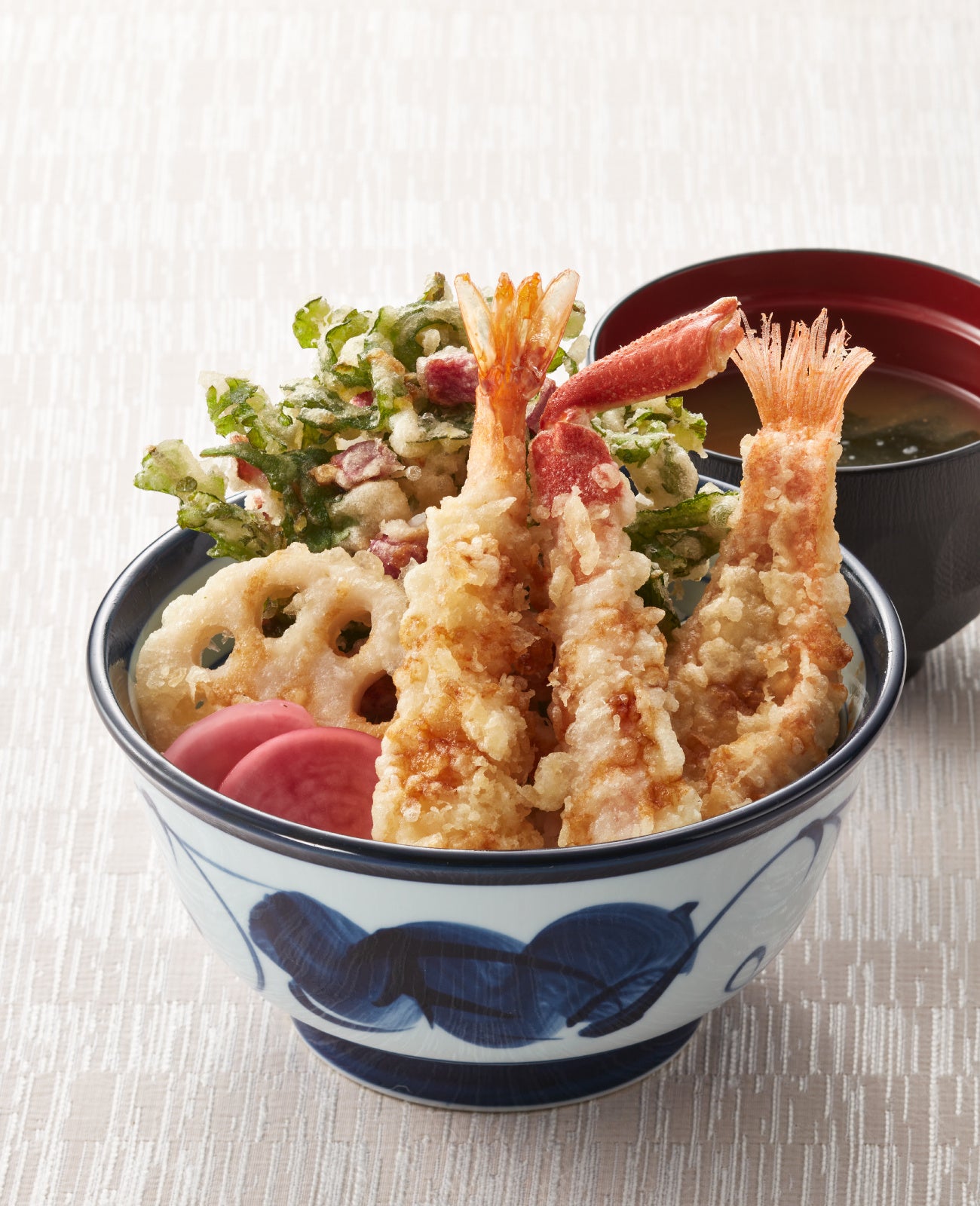 旬の贅沢な素材をのっけた「ごちそうシリーズ」。旨みが詰まった大きな「北海道産肉厚帆立」、冬の定番「ずわい蟹」、ふんわりとし た「活〆穴子」、人気の「海老」の天ぷらと、箸休めにたれとの相性が抜群な青じそ風味の「広島菜漬け」を添えました。冬ならで はの海の幸を堪能できる豪華な天丼です。