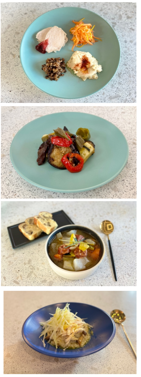 ※写真はキャロットラペ、地鶏ハム、レンズ豆のスパイス風味、フムス