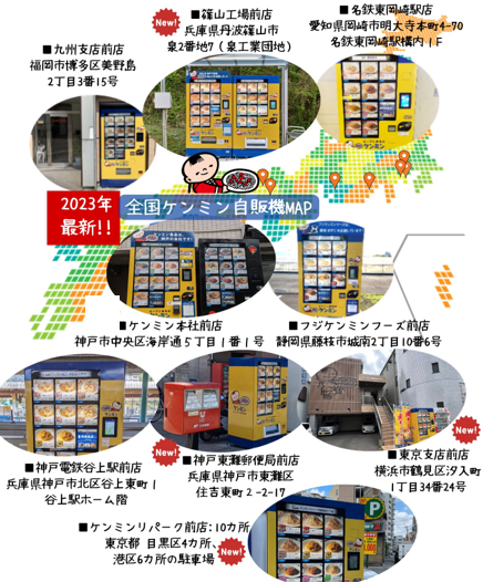 現在、冷凍ビーフン自販機は、兵庫、愛知、福岡、静岡、東京、神奈川の全国6カ所、計19台あります。