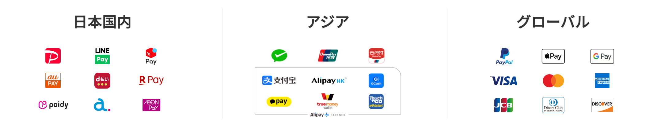 •グローバル:PayPal、Apple Pay、Google Pay、AmazonPay、クレジットカード (Visa、MasterCard、Amex、JCB、DinnersClub、Discover)