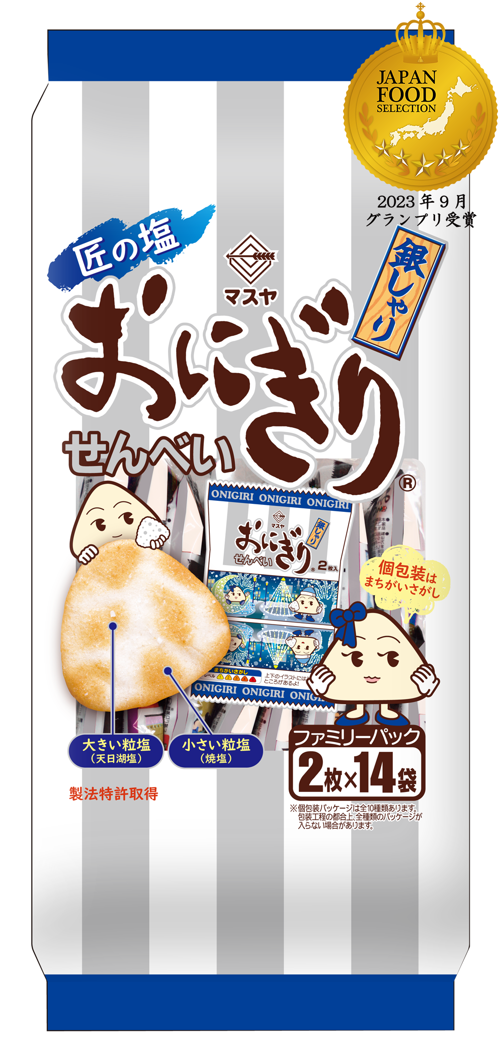 また、昨年発売10周年を迎えた「おにぎりせんべい 銀しゃり」は大きさの異なるつぶ塩がお米の旨味を引き立てる味わいでこちらも人気商品です。「おにぎりせんべい銀しゃりファミリーパック」は「第67回ジャパン・フード・セレクション(2023年9月)」において、最高評価であるグランプリを受賞しました!