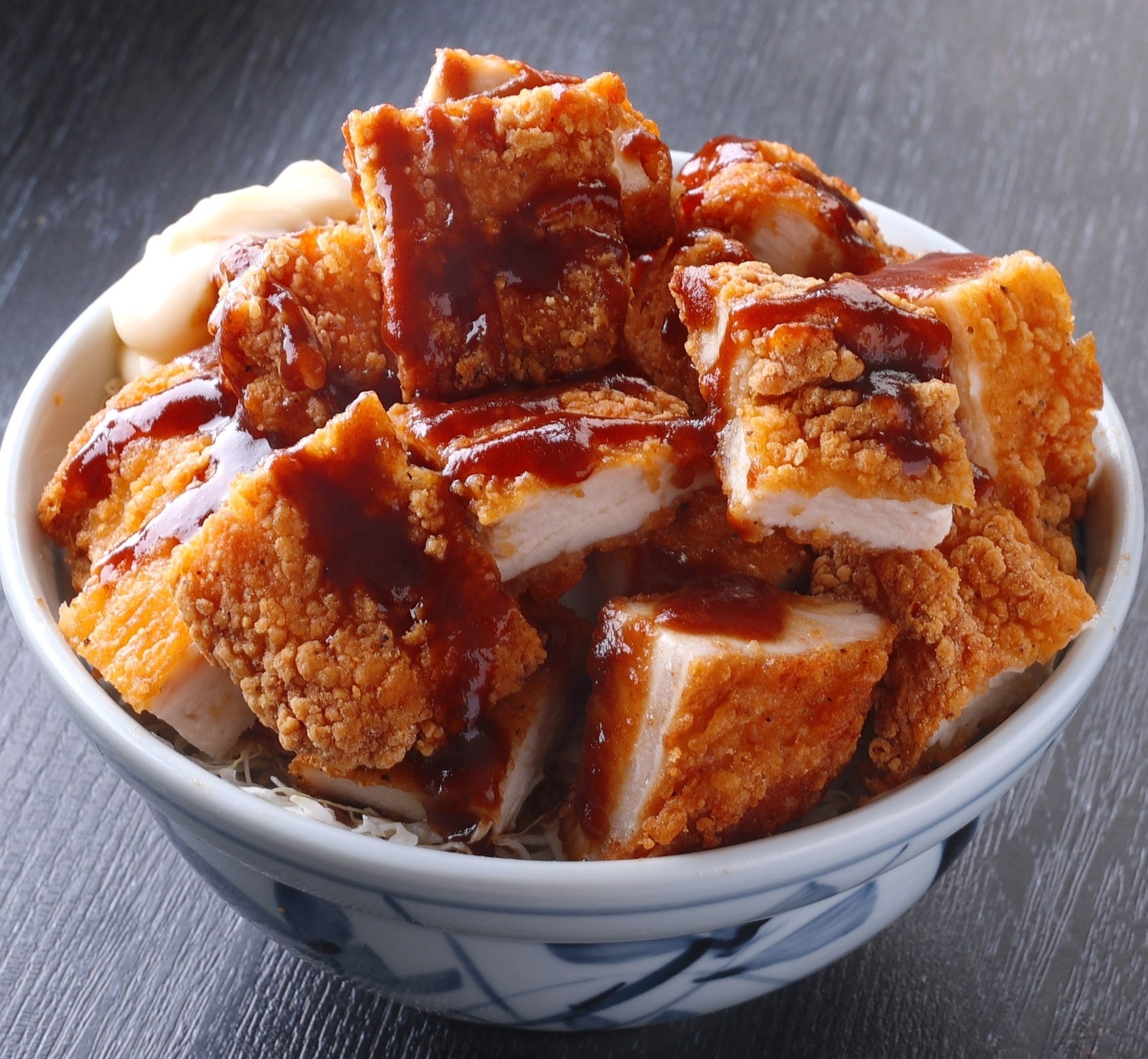 鶏むね肉をサクサク衣で仕上げた、ジューシーなフライドチキンに、ソースカツ丼でも使用している、どんまつオリジナルソースをたっぷりかけた、ボリュームたっぷりの丼ぶりです。