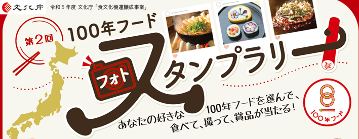 今年も、日本各地の100年フードを育んだ地域への理解と共感を深めるとともに、地域の経済・観光にも寄与することを目的として、100年フードを現地で食べ歩いたり、自宅にお取り寄せして体験する、一般参加型のスタンプラリー「100年フードフォトスタンプラリー」を開催します。