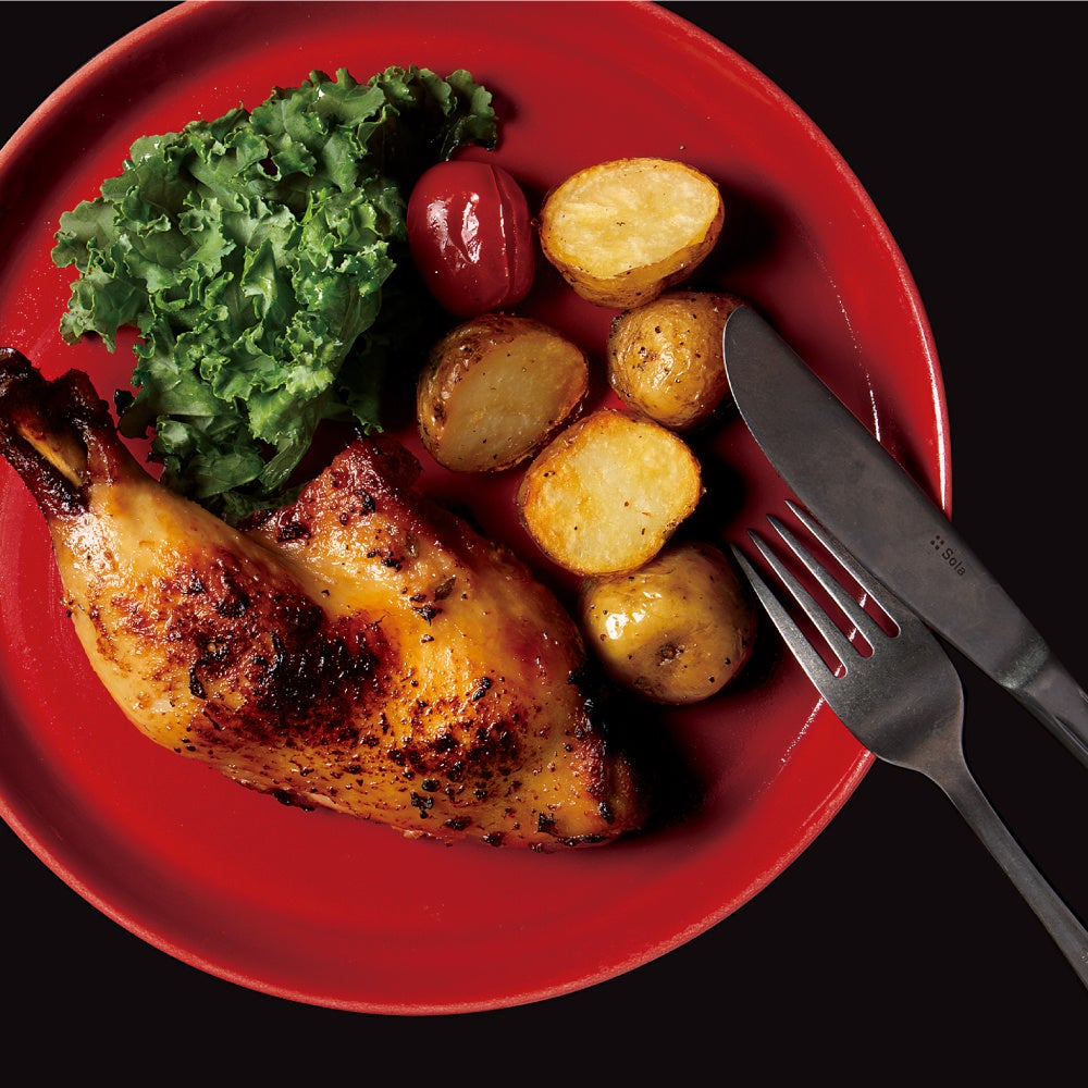 クリスマスディナーの定番、ローストチキン。ボリューミーな骨付きの鶏もも肉を塩麹でやわらかく仕上げました。ほんのり香るタイムとニンニクの香りがGOOD!付け合わせのローストポテトと一緒にどうぞ。