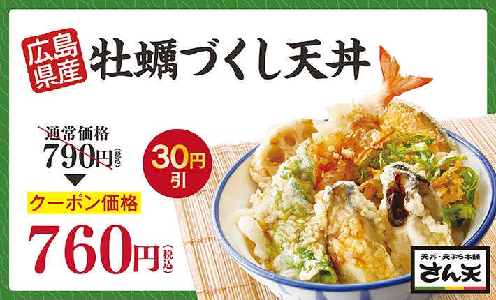 更に「天丼・天ぷら本舗 さん天」公式アプリでは、「牡蠣づくしフェア」30円引きクーポンを配信いたします。ぜひ、お得にご利用ください。