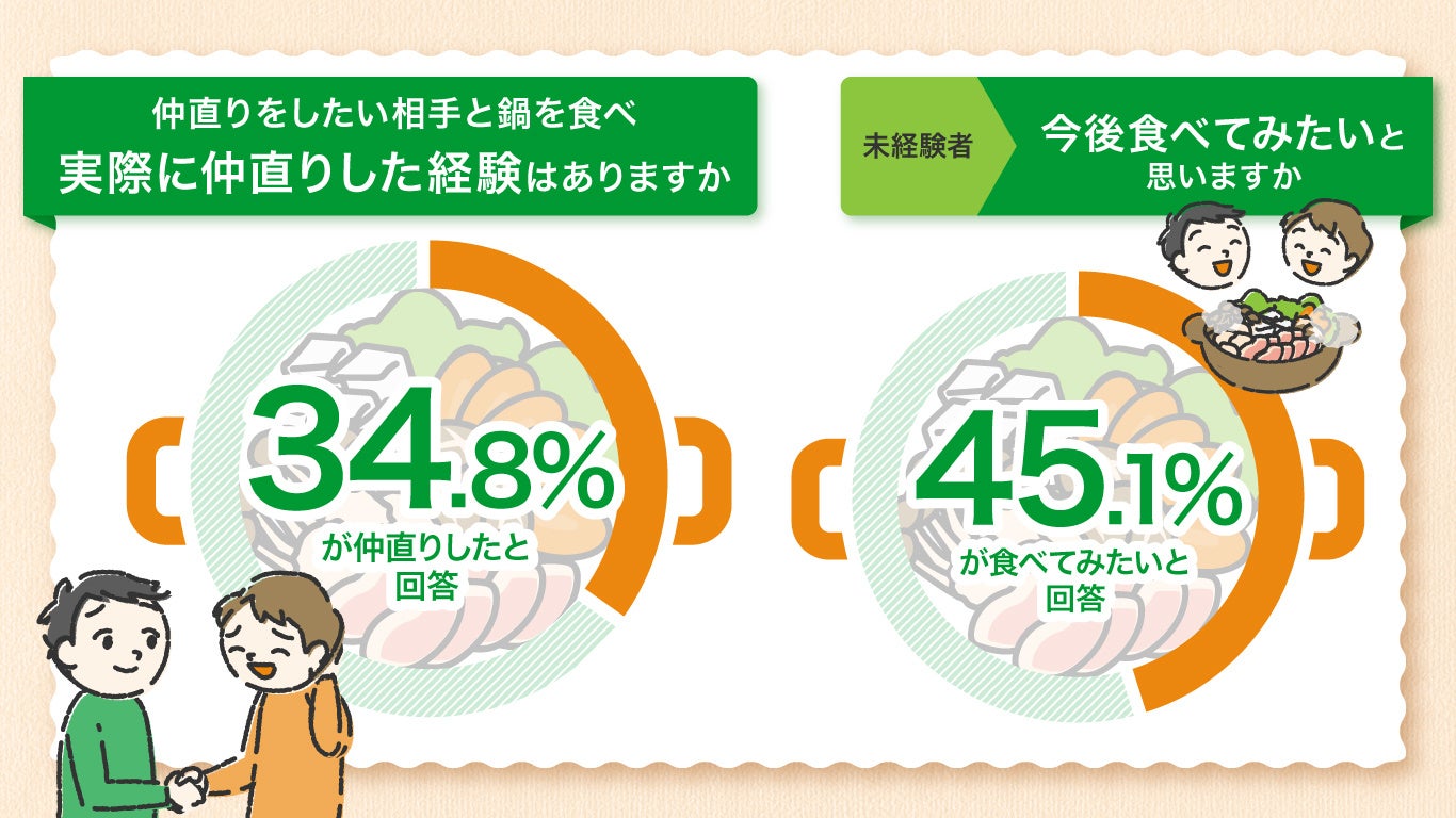 さらに、仲直りのために鍋を一緒に食べたことはないが、今後食べてみたいと回答した人は45.1%と半数近い結果となり、鍋は相手と仲良くなるだけではなく、仲直りするためにも効果的であることがわかりました。