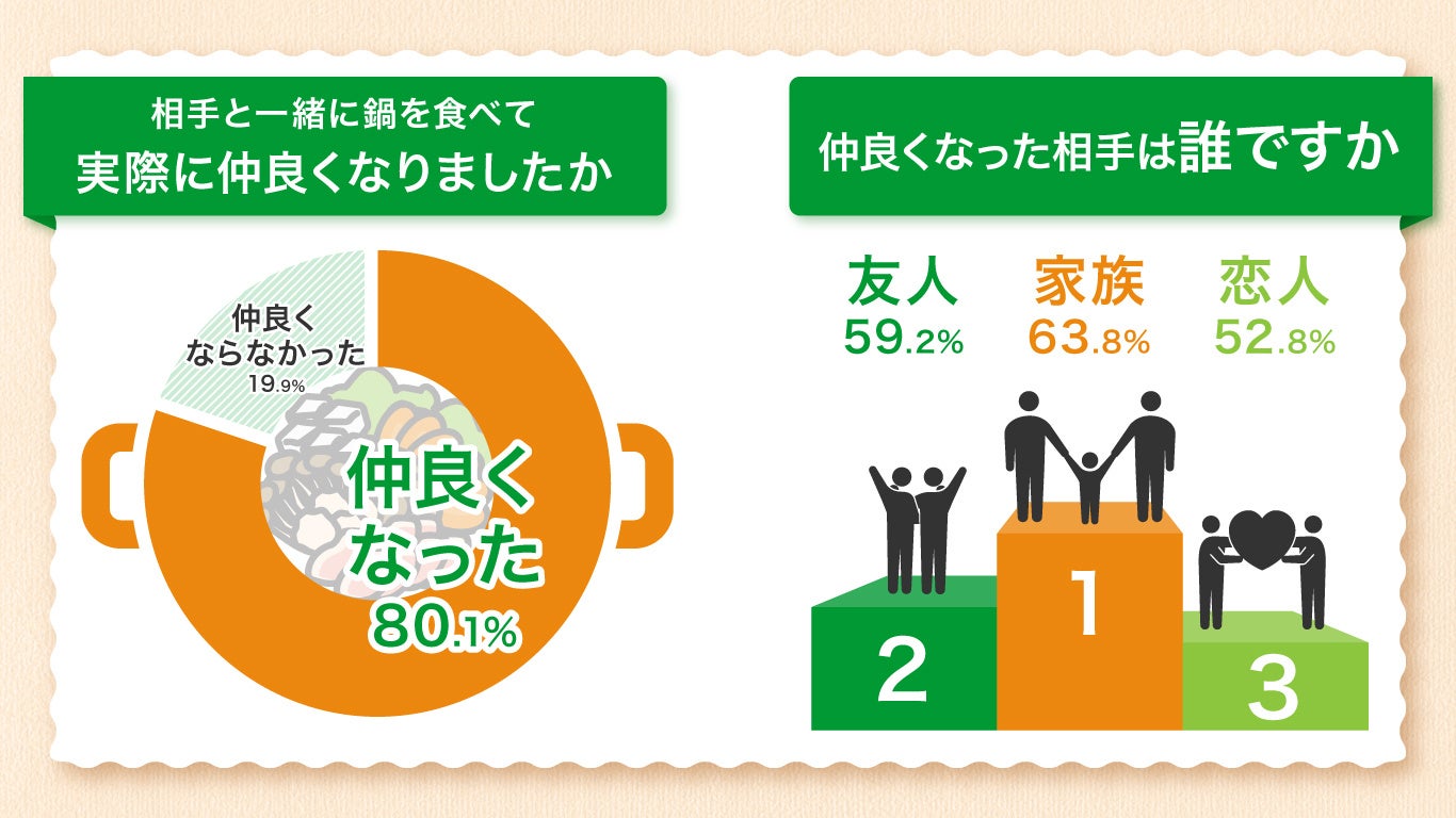 一緒に鍋を食べて、相手と実際に仲良くなった経験があるかを聞いたところ、「とても仲良くなった」もしくは「やや仲良くなった」と回答した人は80.1%と、8割以上が「鍋」を一緒に食べることによって、仲が良くなったと実感したことがあることがわかりました。さらに、仲良くなった相手の回答で多かったのは、第1位「家族」(63.8%)、第2位 「友人」(59.2%)、第3位「恋人」(52.8%)という結果がわかりました。