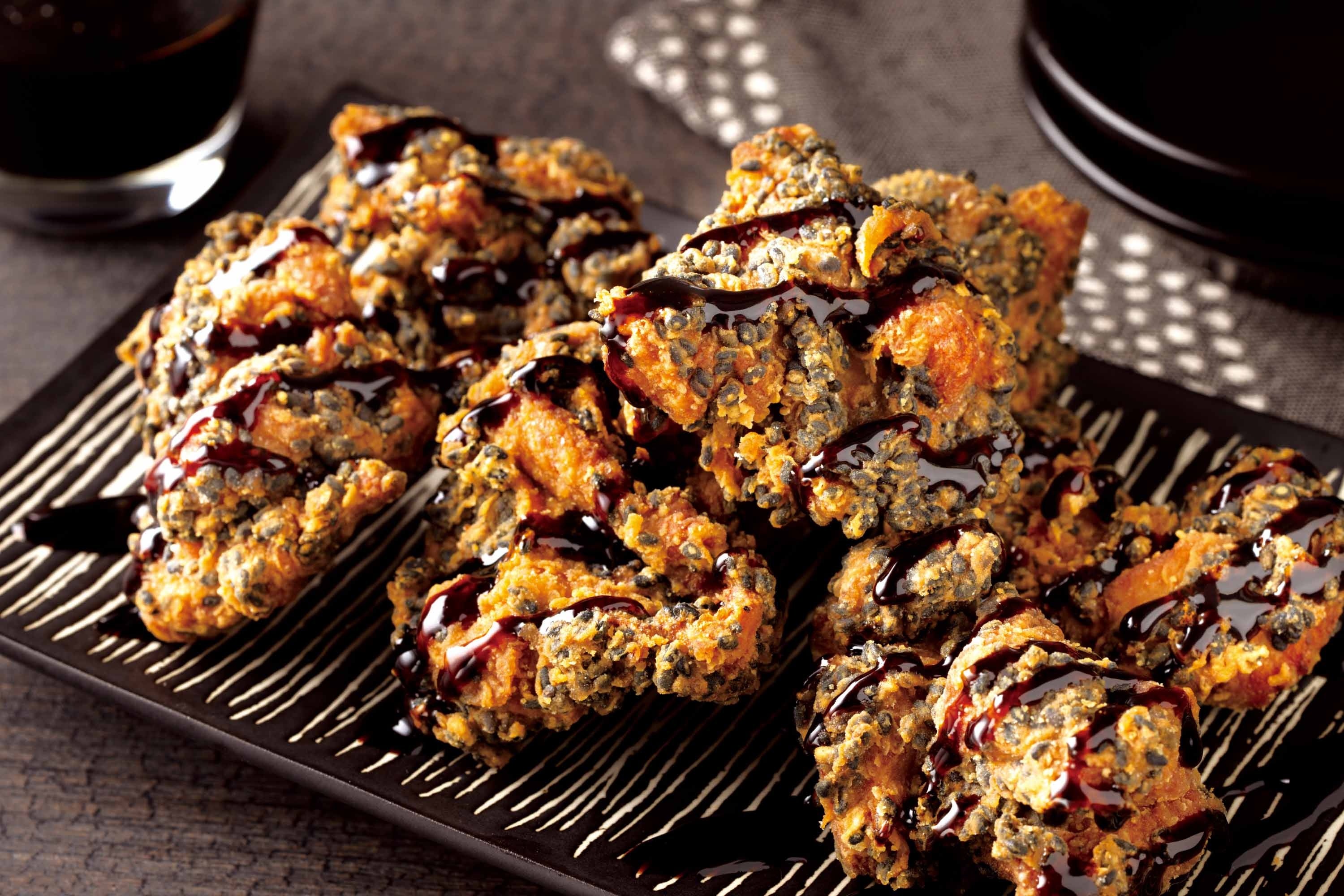 ブラック竜田は、店内で黒ゴマをふんだんに衣に混ぜこんで揚げました。カラっと香ばしい黒ゴマの風味が感じられます。仕上げに、黒酢と黒みりんを使用した深みとコクのあるソースをかけ、何度でも食べたくなる味わいに仕上げました。